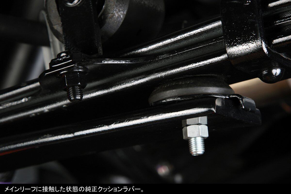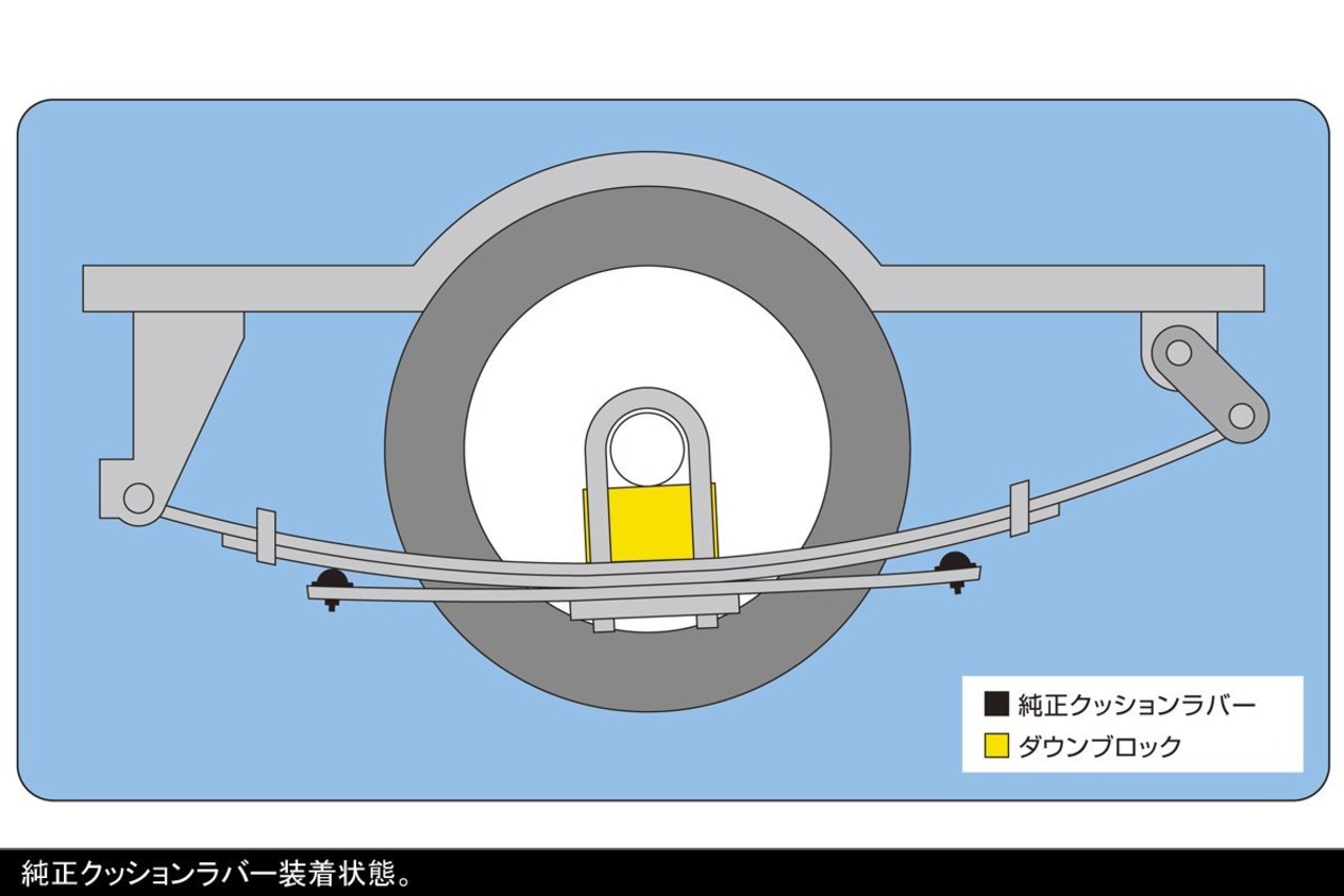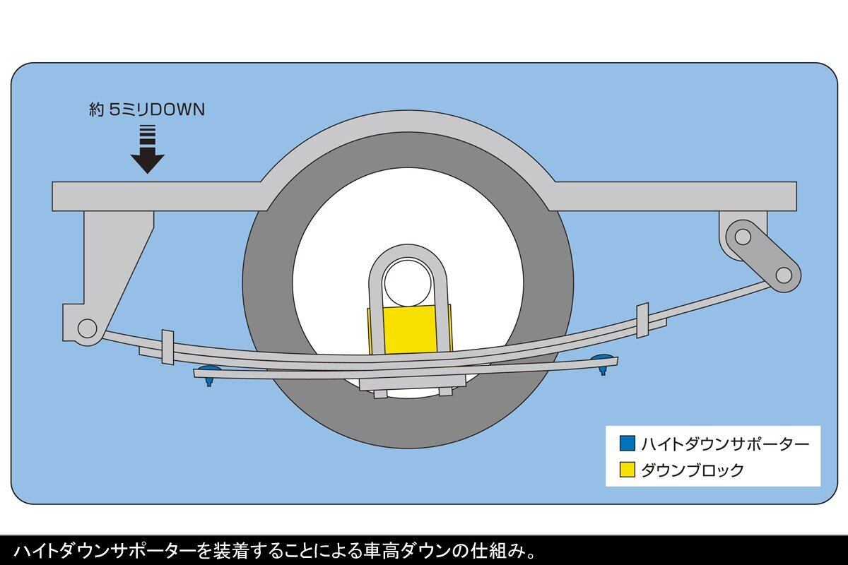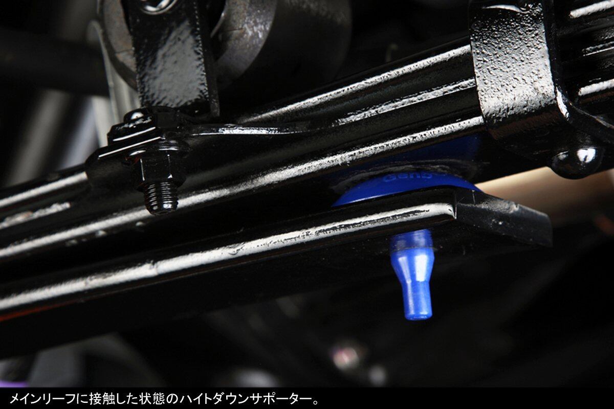 ●ローダウン仕様車に限らず、あらゆる車高に対応しています。●当製品をヘルパーリーフのフロント側へ装着することで車高が約5ミリダウンします。※車両のグレードや個体差、積載重量によっても変動します。●当製品は保安基準適合品ですが、車検については検査員の判断が優先されますのでご注意ください。当製品には硬度の低い合成樹脂を使用しています。経年使用に対して、変形・潰れの発生する可能性のあることをご理解ください。●当製品は以下の車両型式には適合しておりません。「TRH214W/TRH219W/TRH224W/TRH229W」