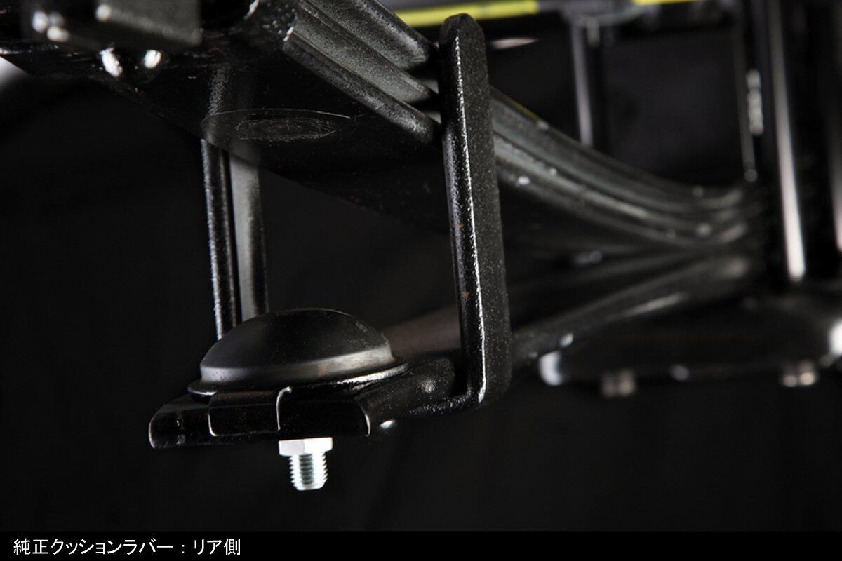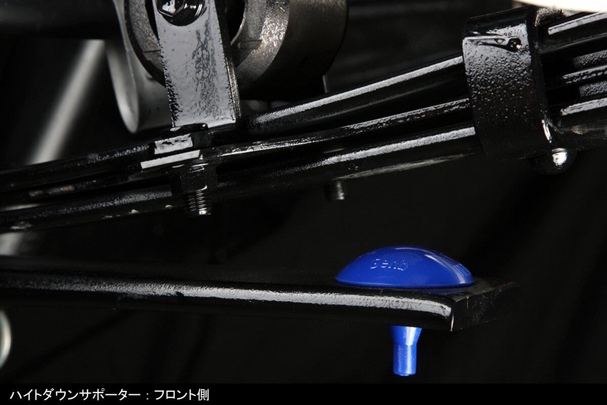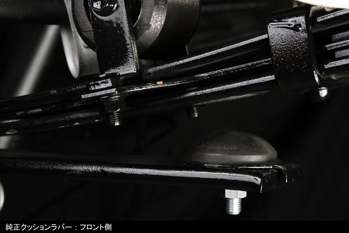 主にバン仕様のハイエースに装備されるヘルパーリーフ。幾重にも重なるリーフスプリングの最下段に位置するヘルパーリーフが作動することで、積載重量に応じて効果的にレートアップを図るバリアブルレート機構が採用されています。しかし、残念ながら、特に空積載時などは唐突にヘルパーリーフが作動してしまうため、それによって引き起こされる突き上げが乗り心地を損なう要因となっているのが現状です。“ハイトダウンサポーター"は、ヘルパーリーフの前後に装着されているゴム製クッションを低反発の軟質合成樹脂パッドに交換することで、作動時のショックを緩和し、スムーズなレート変化による安定した乗り心地を実現します。薄型形状がもたらす車高のチョイ下げ(約5ミリ)効果も相まって、街乗りハイエースには絶好のアイテムです。