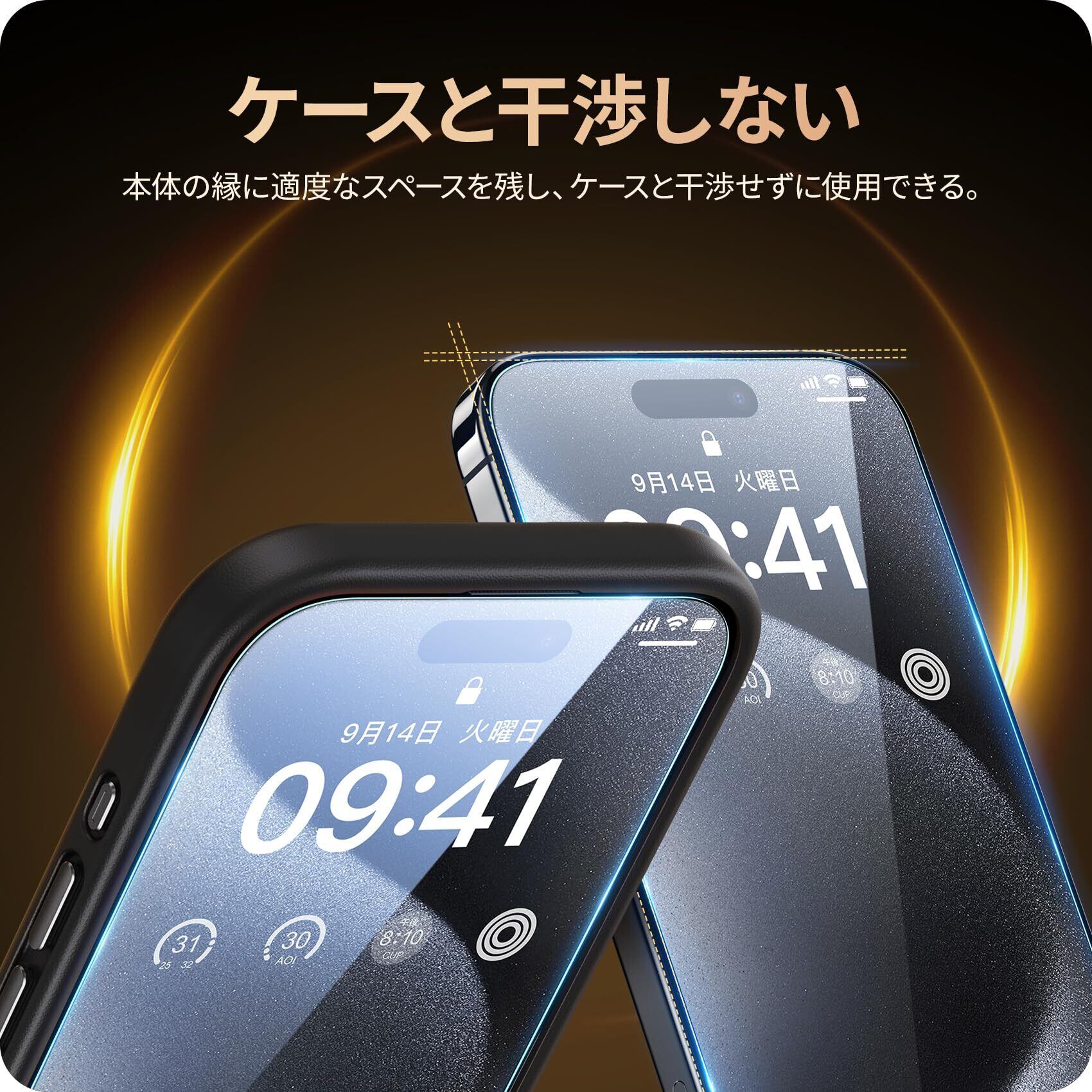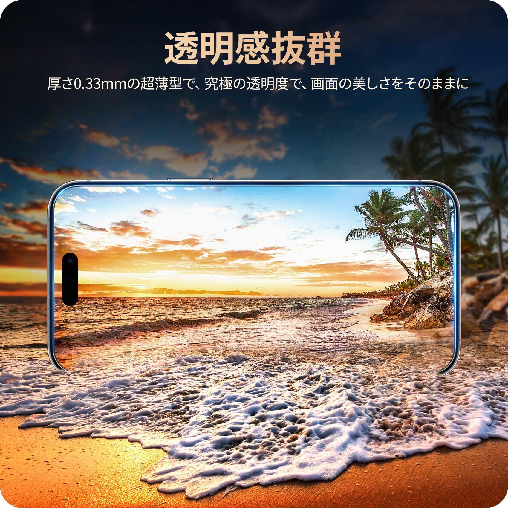 【薄型ガラス・ケースと干渉せず】厚さ0.33mmの超薄型で、透過率は99.99%。驚くほど高い透明度を誇っており、画面の鮮明さや美しさを損なわずにiPhone本来の美しい画面をお楽しみいただけます。2.5Dラウンドエッジ加工が施されており頑丈でありながら、装着後もスマートフォンのデザインを損なわず、ケースとの相性も抜群です。*本フィルムは、上部スピーカー部分に切り欠き加工がない仕様です。ご購入前にご確認ください。