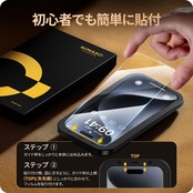 【たったの3ステップ・初心者でも綺麗に貼れる】ガイド枠をはめる→上側に合わせて、フィルムを置く→軽く押すだけで自然に吸着。初めての方でも簡単に貼り付けられるよう、専用の貼り付けガイド枠を同梱しています。スマホと保護フイルムがズレることなく、だれでも簡単にフィルムを貼ることができます。