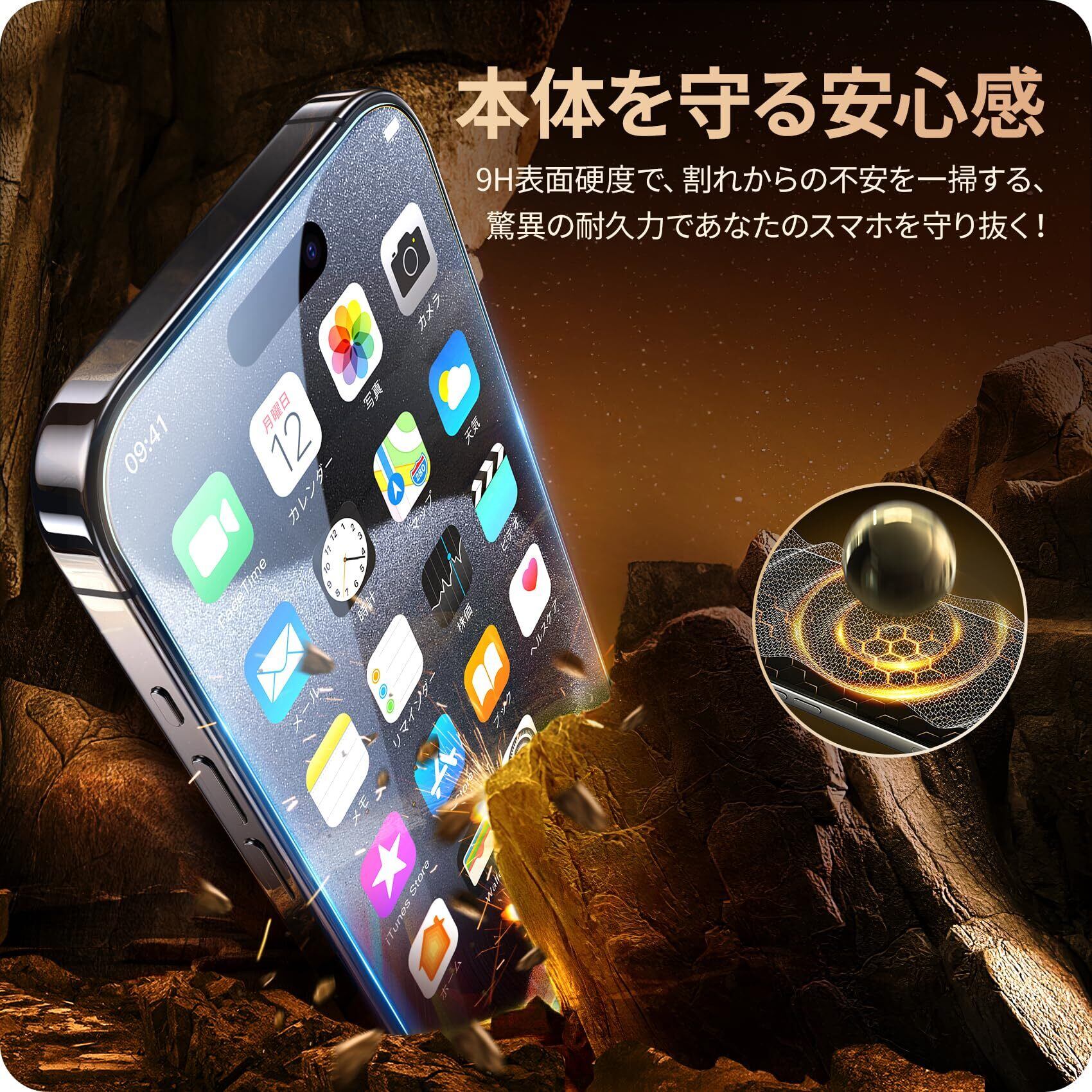 【米軍規格・傷や衝撃に強い】米軍規格「MIL-STD-810H」に準拠(認証番号:SZXEC23002005001)・9H表面硬度ガラスを採用しています。スマートフォンがカバンの中で、鍵などの鋭いものにぶつかっても傷が付きにくく、スマホの画面をしっかり保護します。飛散防止加工により、万一割れてもガラス破片が飛び散ることなく安心です。