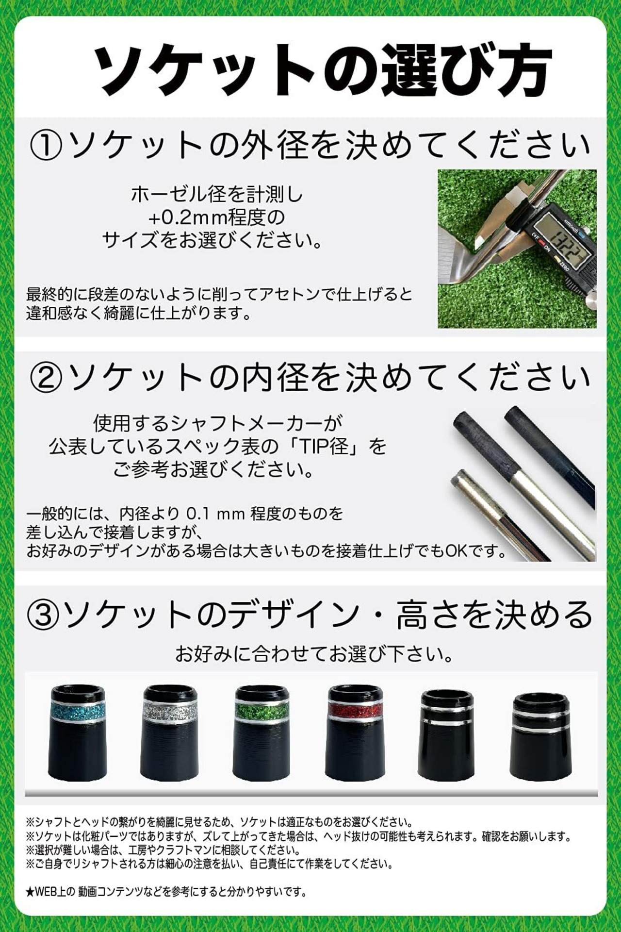 【チップ径】 スチールシャフト、カーボンシャフト、テーパーorパラレルなど、圧入する場合は使用するシャフトが公表しているスペックをご参考ください。デザインを優先する場合は大きいものを接着剤で仕上げてもOKです。335、350、355、370をご用意しております、ご購入前にデザインとサイズを画像のラインナップより今一度ご確認お願いします。