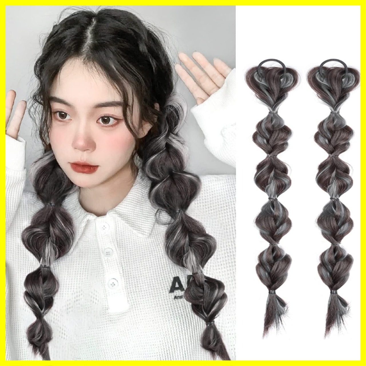 ヘアエクステ 編み込み ウィッグ エクステンション ポニーテール ウィッグ カラー エクステ 編み込み エクステ 付け毛 カラフル 髪の毛 ウィッグエクステンション キッズ 子供 大人 ダンス 発表会 イベント パーティー コスチューム 2本セット (グレー)