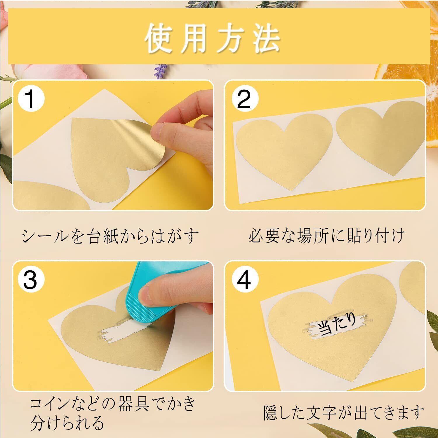 ハート型のスクラッチシールで、可愛くておしゃれです。ゴールド、シルバー、レッド、3色から選べます。厳選された接着剤を使用しており、貼りやすく、コインなどで簡単に削ることができ、イベントや結婚式、パーティーなどに使用されます。様々なイベントにサプライズをもたらす。