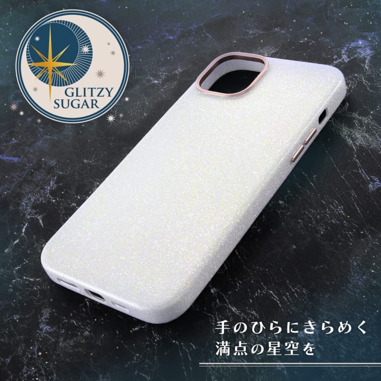 特殊なラメ加工を施したキラキラと綺麗な素材感のケース。