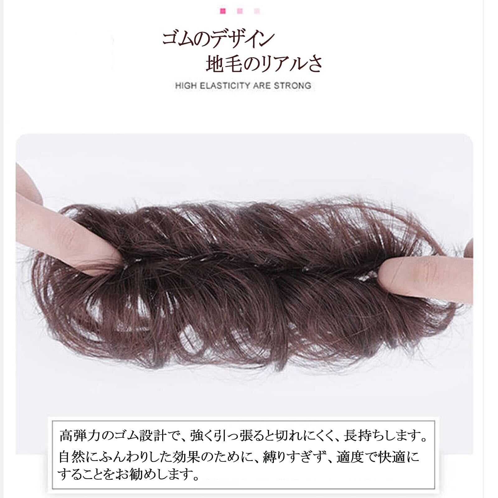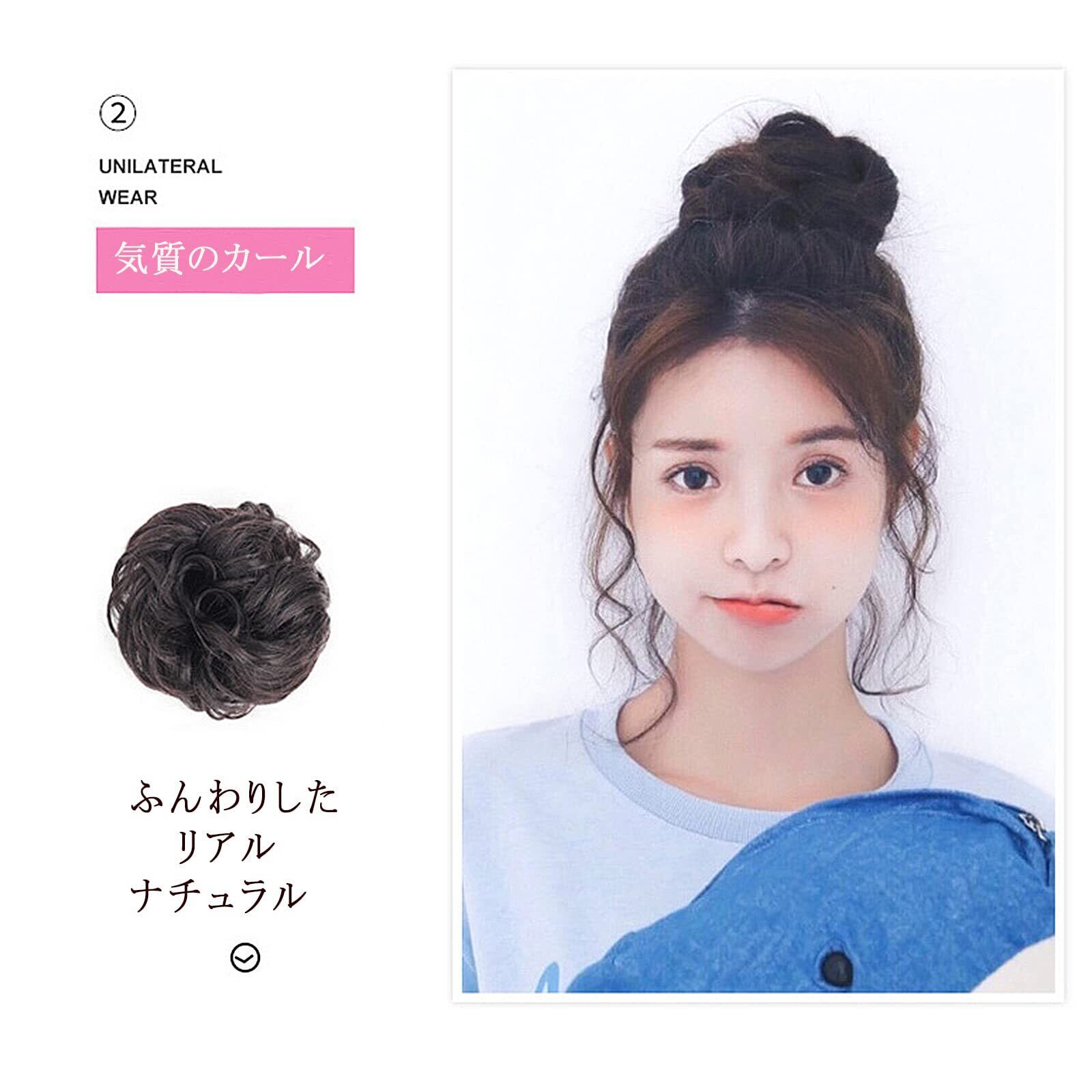 「簡単使用」ゴムのシュシュウィッグです。髪を巻き上げるだけでふわふわとしたお団子になります。