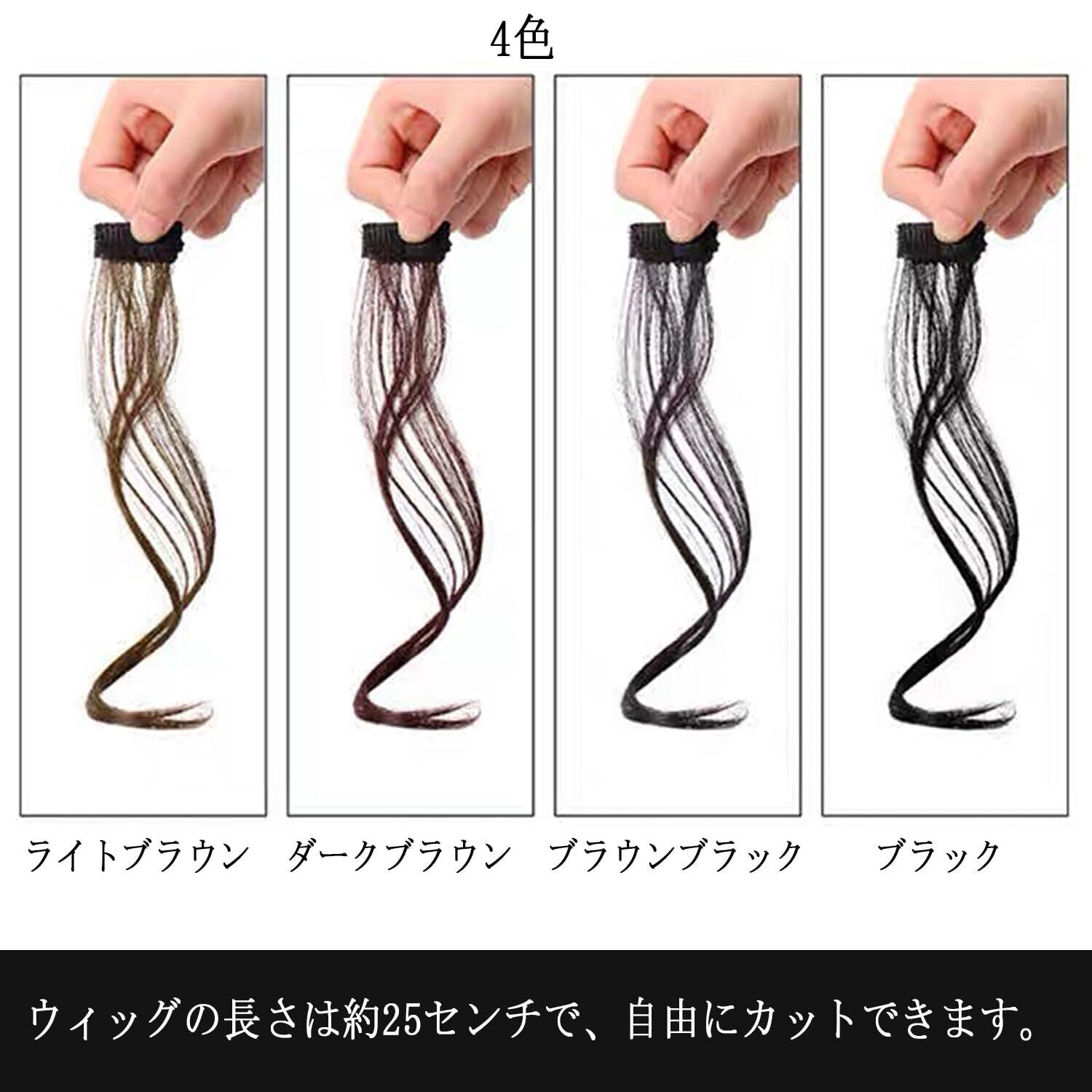 「サイズ、カラー」前髪のヘアエクステの長さは25センチです。ブラック、ブラウンブラック、ダークブラウン、ライトブラウンの4色から選べます。2枚のウィッグセットです。