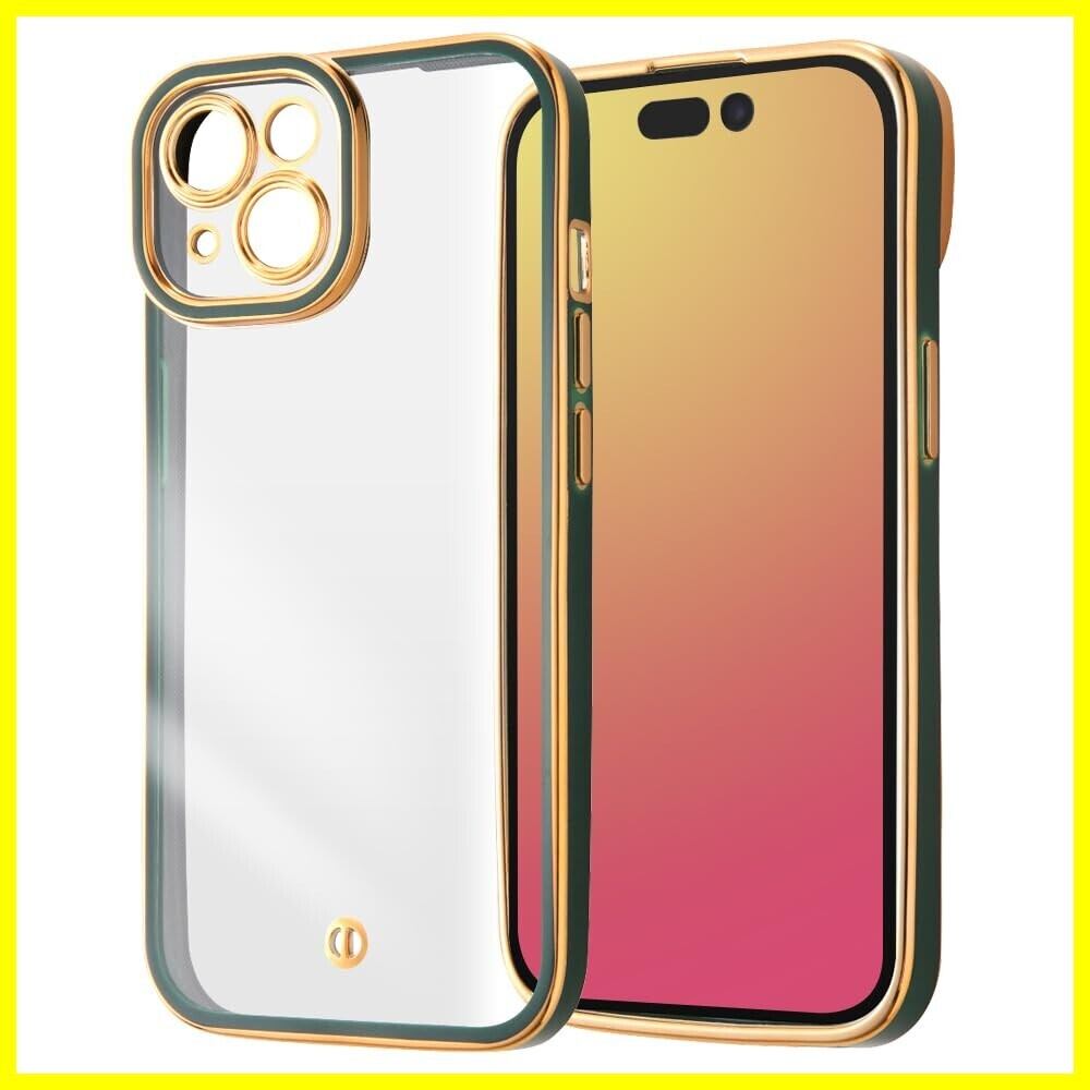 iPhone15 ケース クリア メタル フレーム カメラ保護 耐衝撃 メッキ加工 ストラップホール 付き アイフォン 15 カバー/グリーン/ゴールド