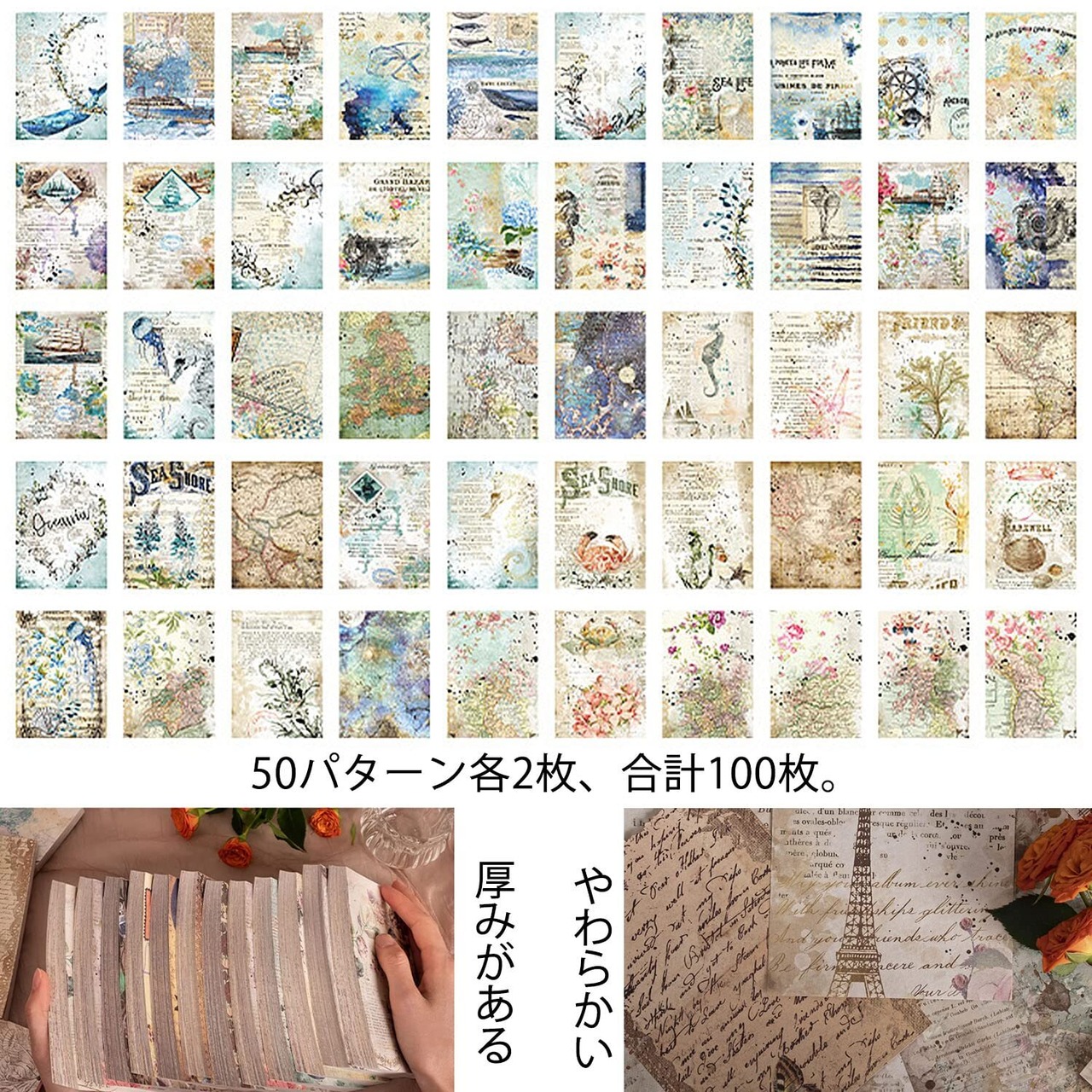 「デザインペーパー」素材紙は両面印刷で、印刷がはっきりしています。50個の異なる絵柄があり、合計100枚の容量があります。