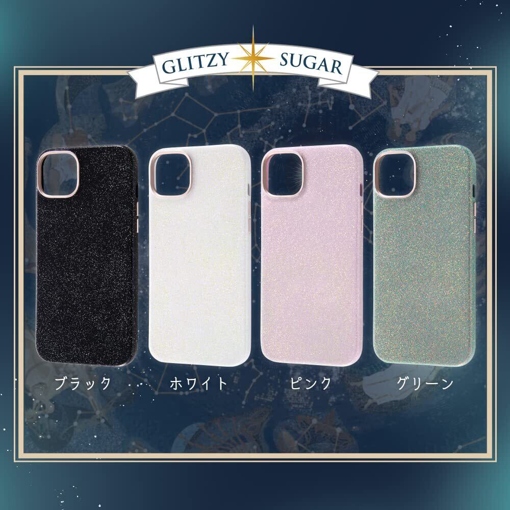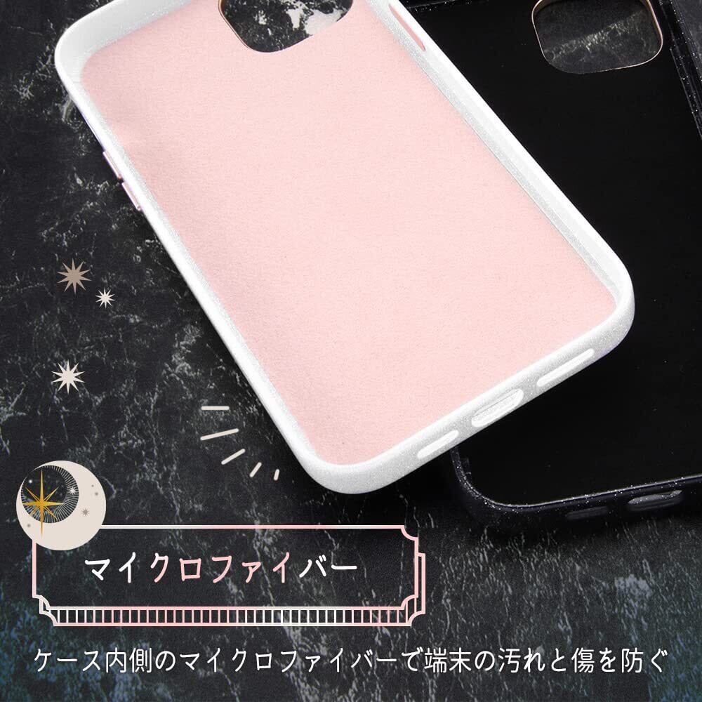 特殊なラメ加工を施したキラキラと綺麗な素材感のケース。サイドボタンやカメラ周りなど統一感のあるメタリックパーツ。内側はやさしく端末を守るマイクロファイバー素材。ラメ塗装ですが表面はツルっとした仕上がりです。メタリックカラーの上に大小ランダムに数色のラメを取り入れてみる角度によって色味、煌めき具合が変わりキラキラと華やかに演出してくれます。
