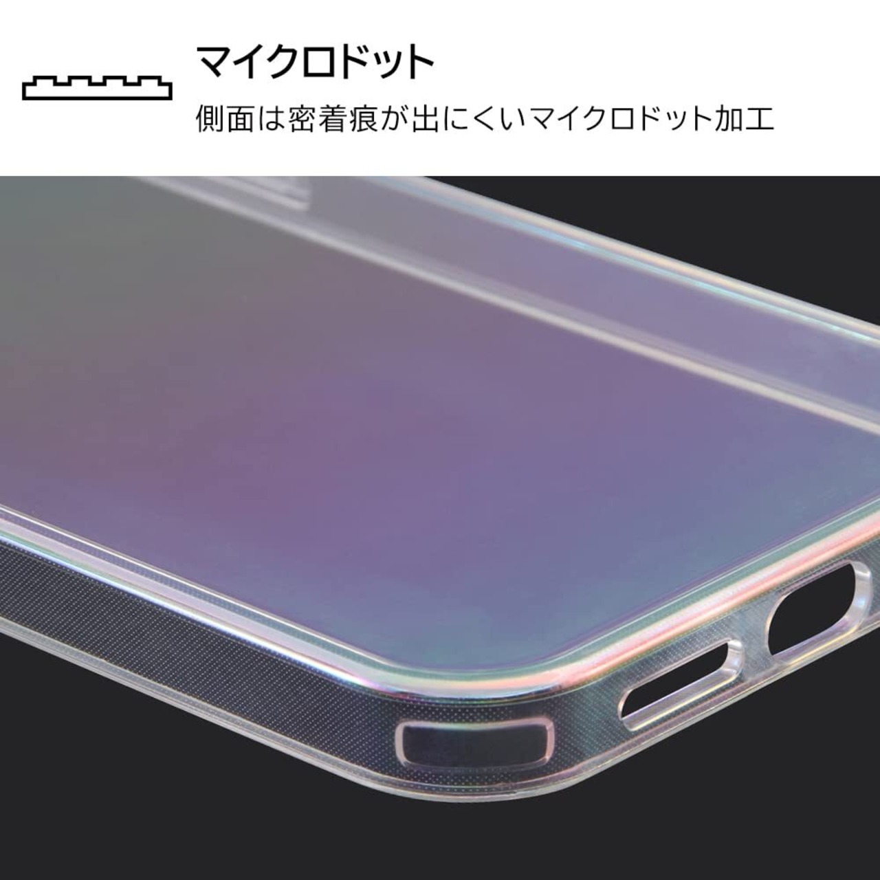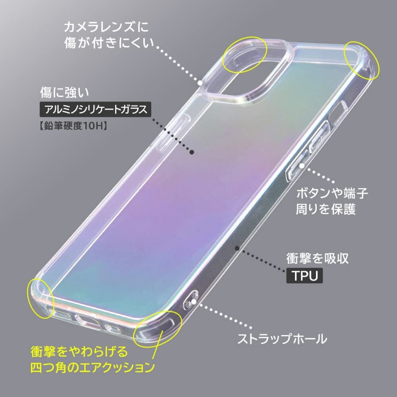 オーロラ、レインボーとも例えられる見る角度によって色目、表情を変える、強く美しいガラス素材を背面に採用した耐久性、透明度に優れたクリアケース。