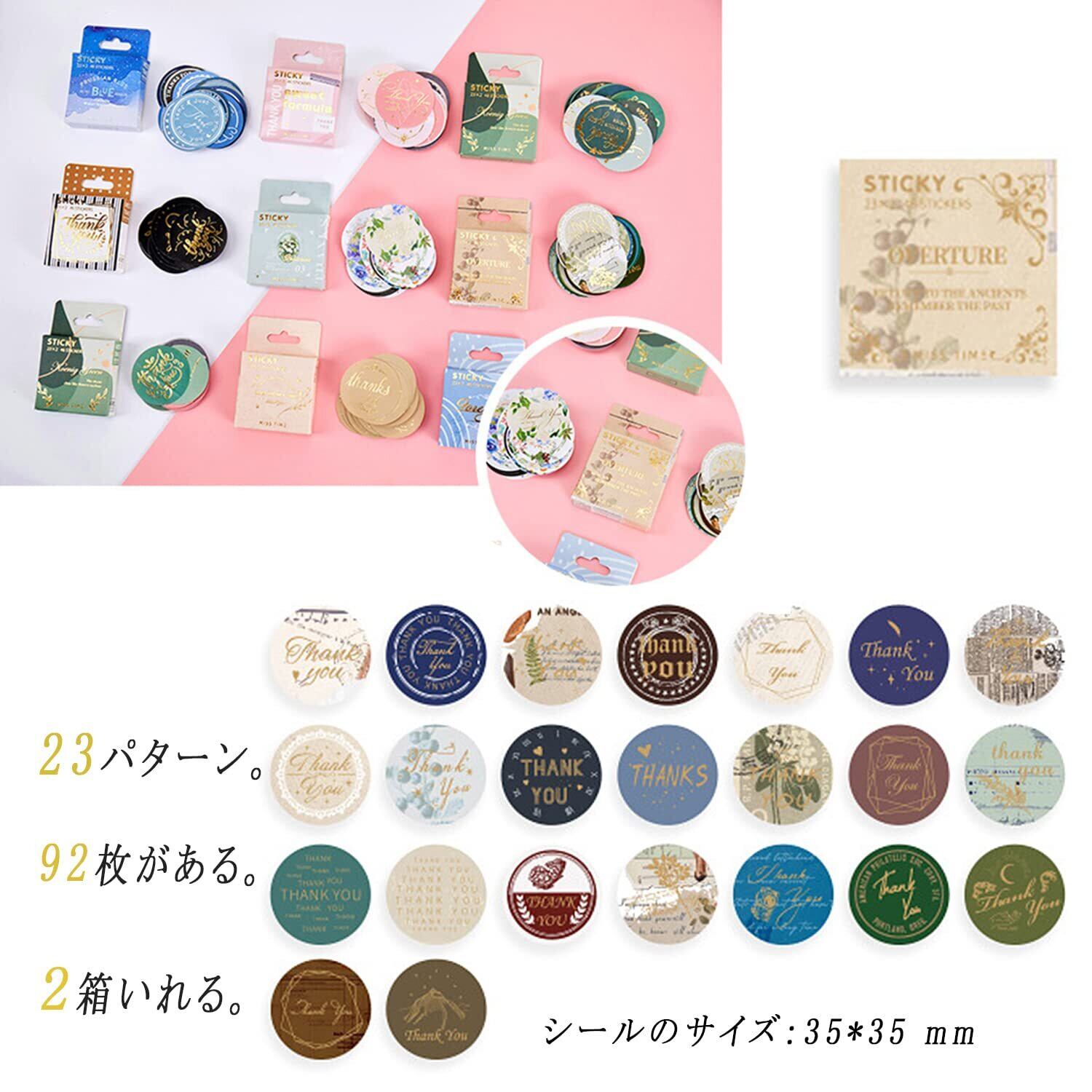 「セット内容」シールの直径は約3.5cmです。2箱入りで、1箱ずつ繰り返さないかわいい絵柄が23種類、合計92枚の数量があります。箱入りのデザインで保管に便利!感謝シールの数が豊富で、思い切り使用できます。