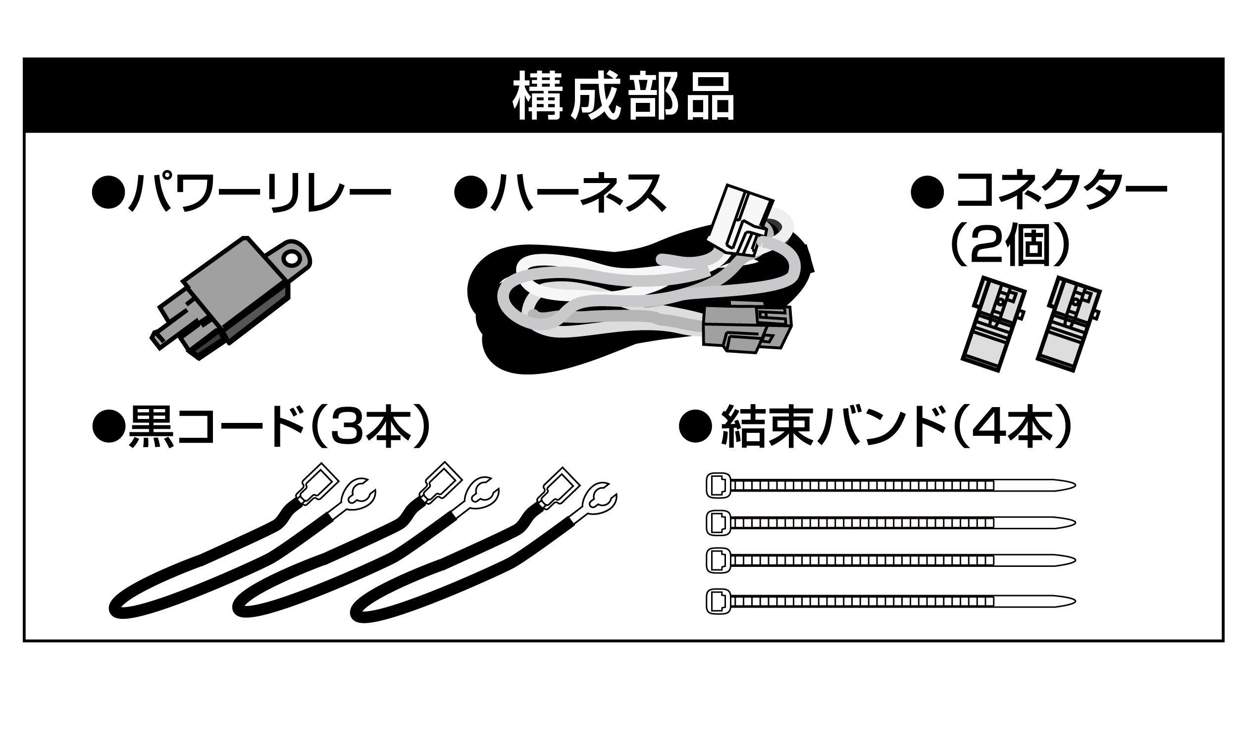セット内容 ハーネス、パワーリレー、黒コード3本、コネクタ2個、結束バンド4本