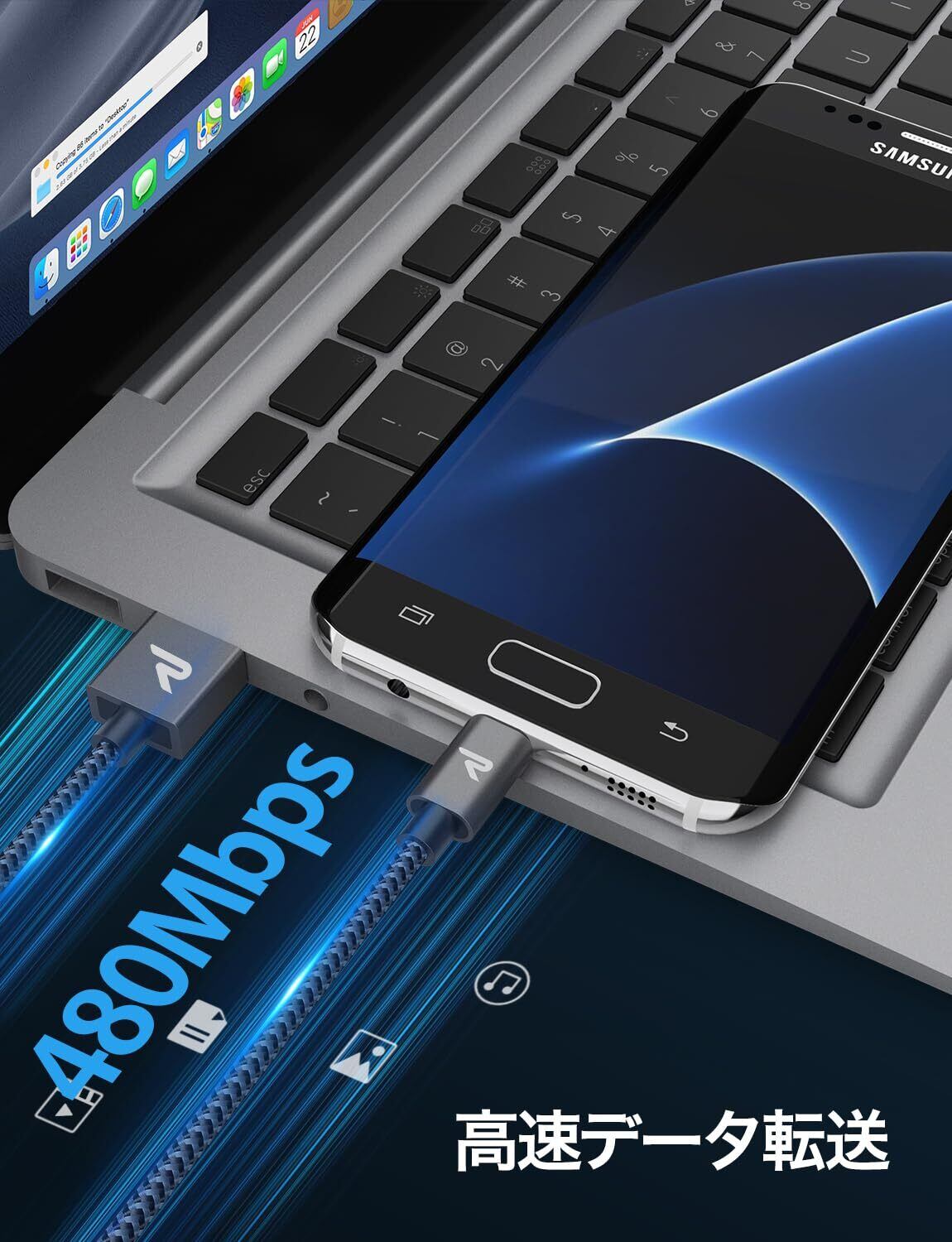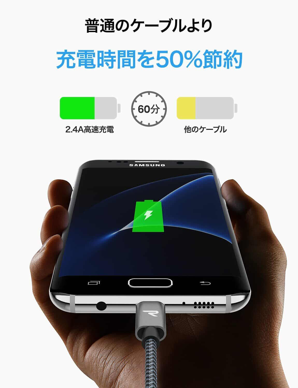【高速充電とデータ転送】2.4A充電ケーブルは、標準タイプのケーブルより高速に充電し、USB 2.0経由で480Mbitsまでデータ転送可能。
