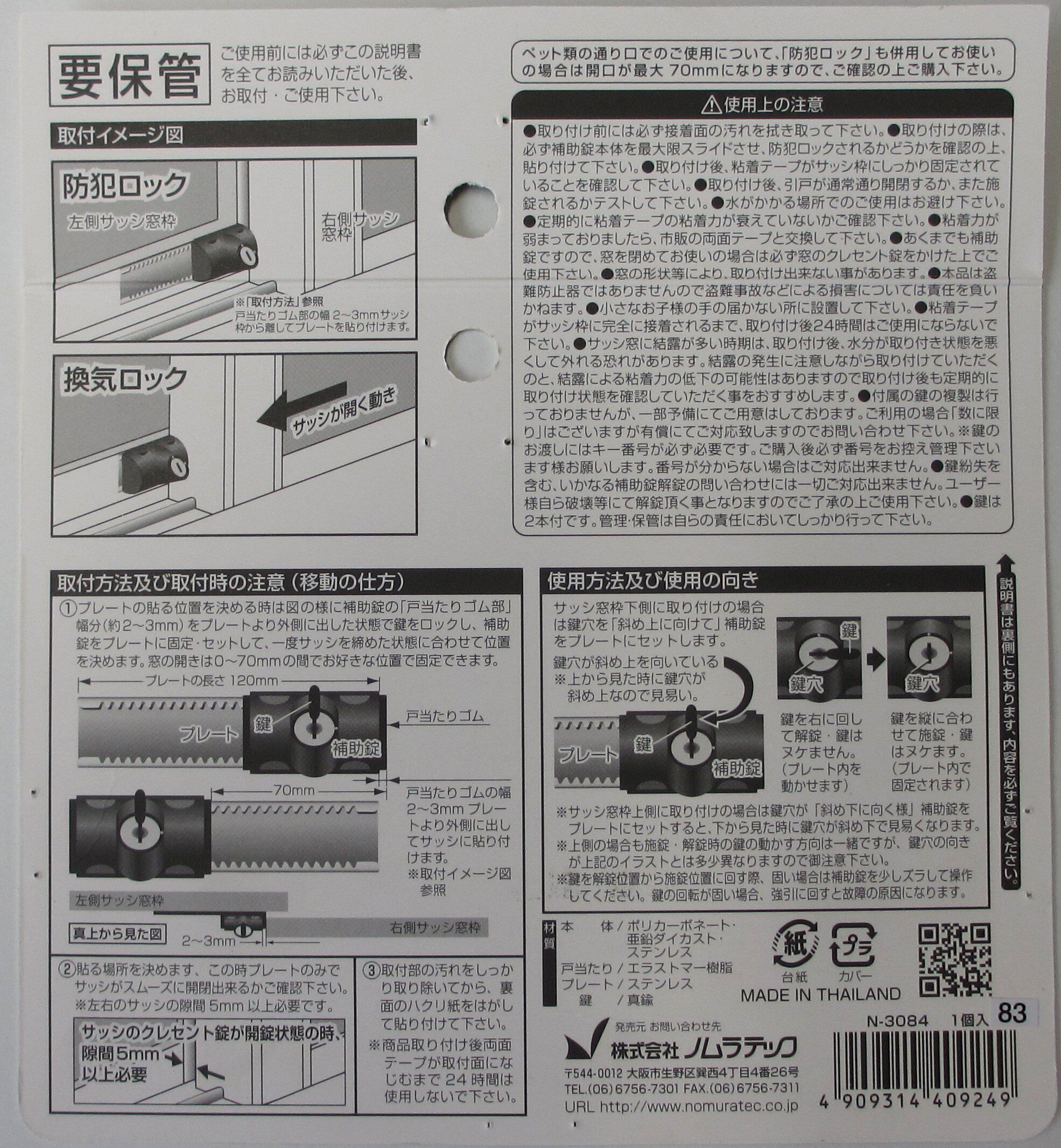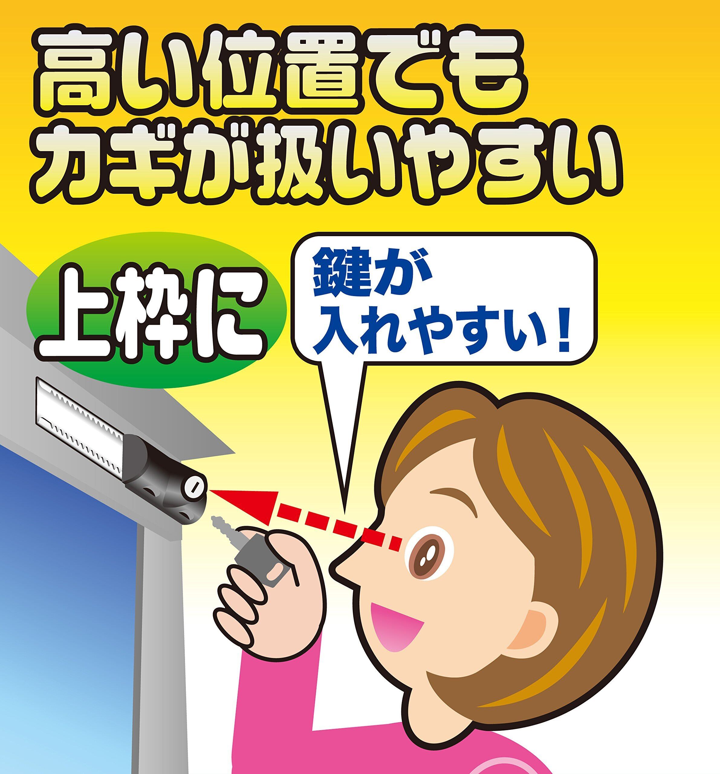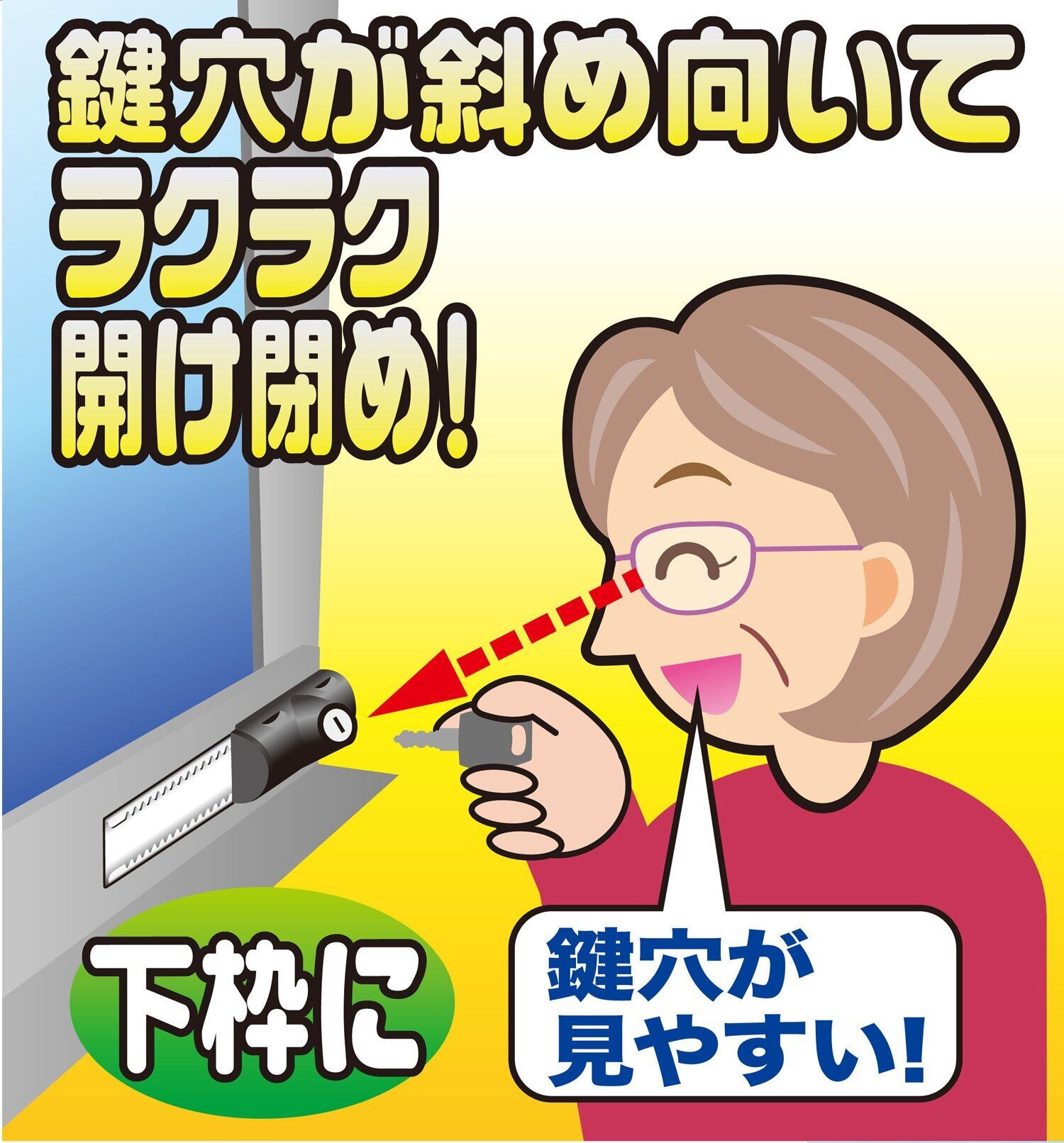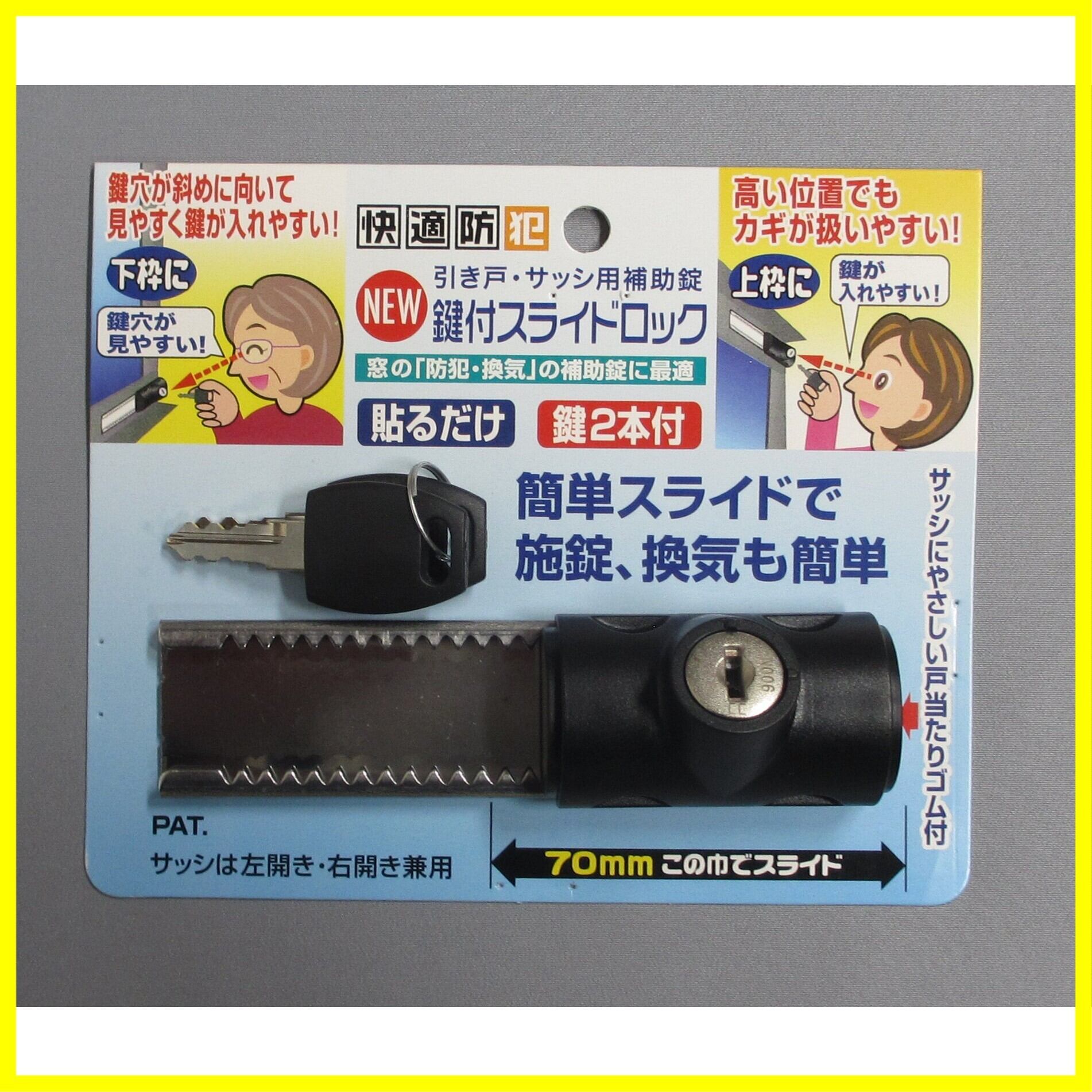 サッシ枠に貼り付けるだけで、防犯補助錠として、また少し開けての換気ロックとして使えるスライドロック。 換気スペースは0~70mmの範囲で好きな幅に決められ、小さなペットも通れる(最大幅70mm。サイズを十分お確かめの上ご使用ください)。 鍵穴が斜めなので、サッシ枠の上部でも下部でも鍵穴の確認や抜き差しがしやすい。お子様からご年配の方まで簡単に使える機能性に優れたロック。 戸当りゴム付きでサッシにやさしい設計。