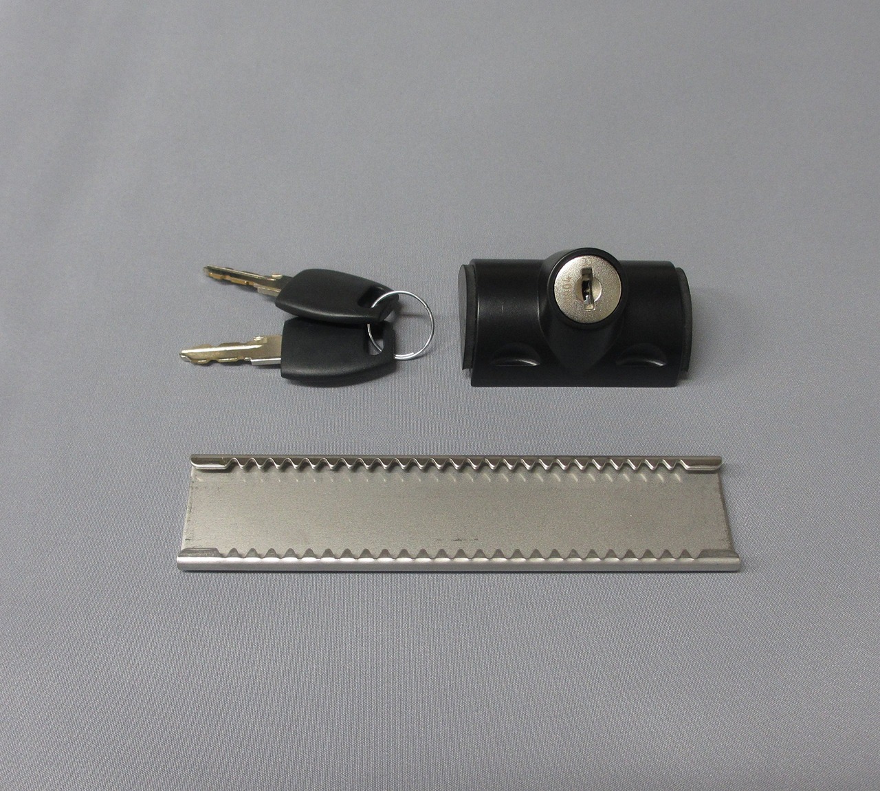 素材・材質:本体=ポリカーボネート、亜鉛ダイカスト、ステンレス、戸当たり=エラストマー樹脂、プレート=ステンレス、鍵=真鍮