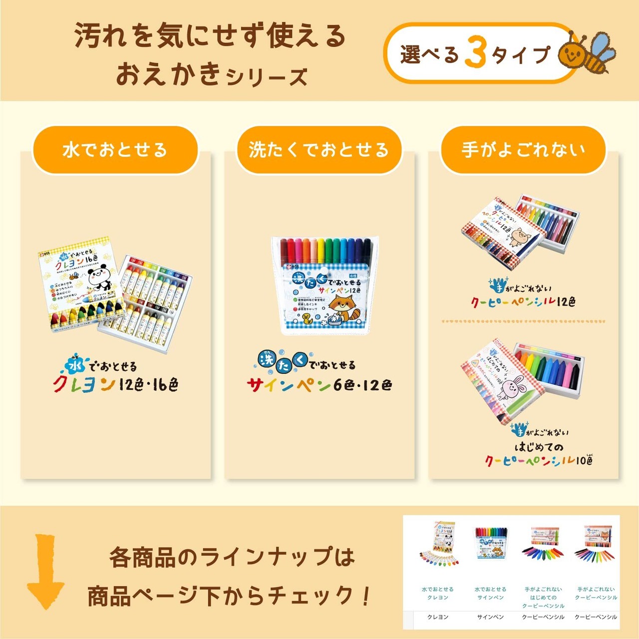 力いっぱい握って描いても折れにくい太さです。手足や体についても水で洗えば容易に落とせます。持ち運ぶ時散らばりにくいゴム付ケースです。