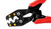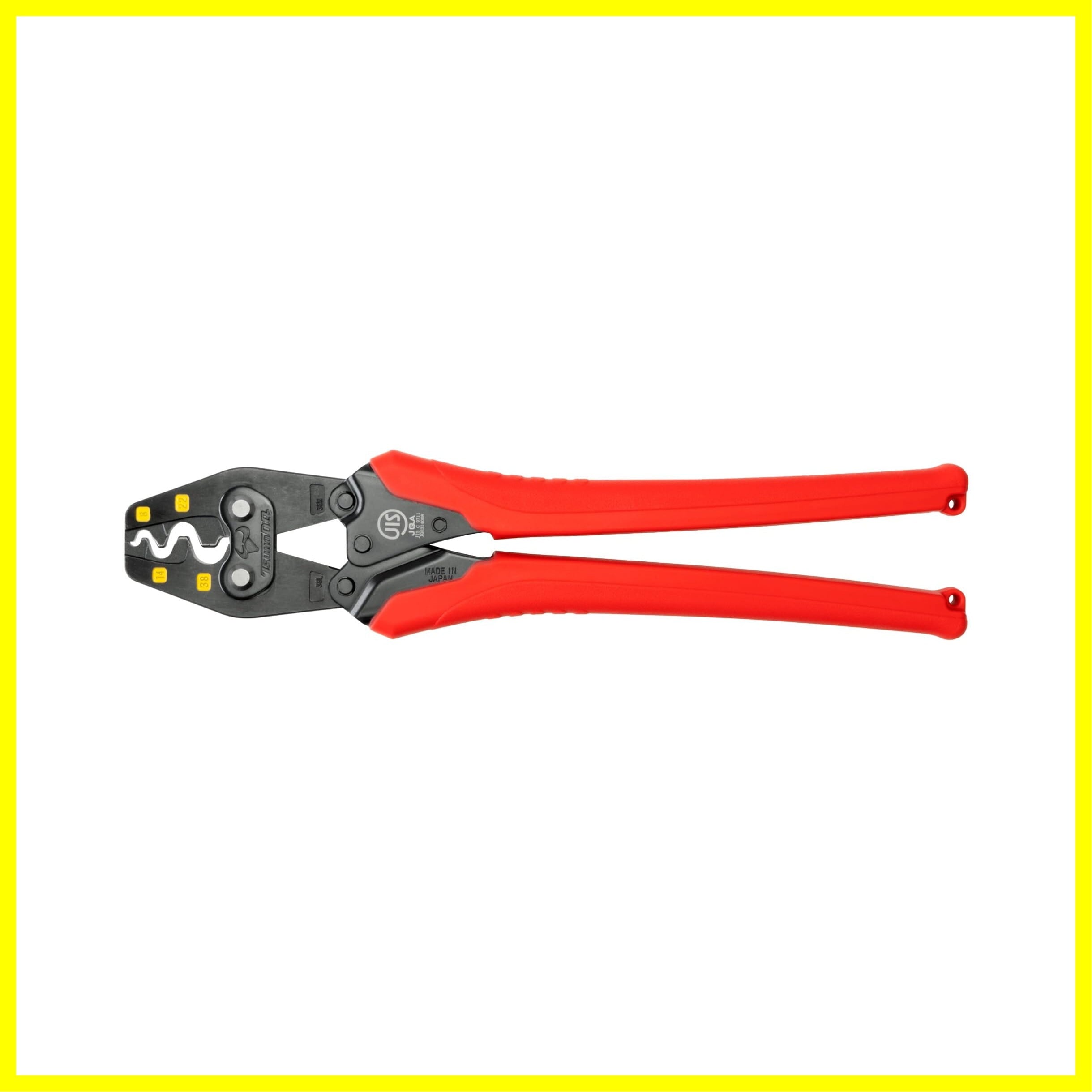 JIS認証取得商品。安心安全確実スピーディーな圧着。裸圧着端子38まで圧着が可能。グリップは力が入れやすいよう太く・エラストマーグリップを採用し手の負担を軽減。電線挿入作業時に端子がつぶれずに仮押さえができるので作業がスムーズに進みます。