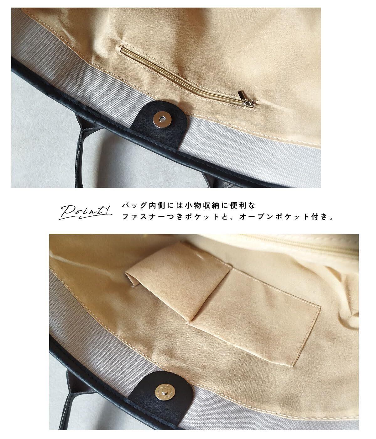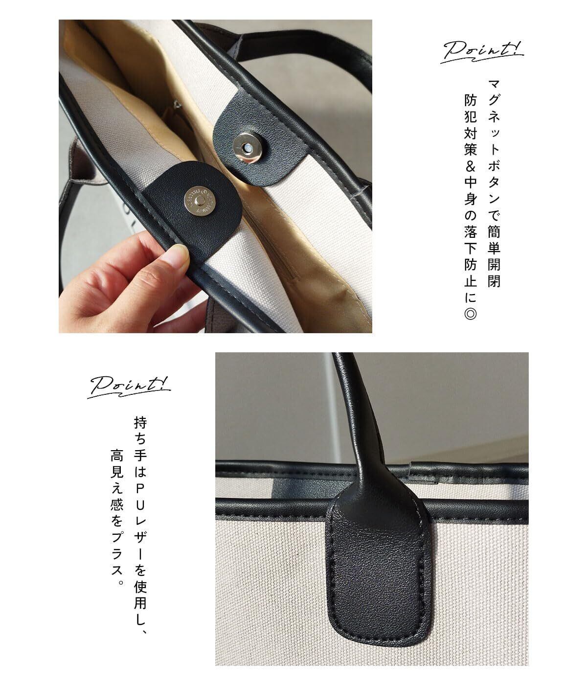 マグネットボタンで開閉が簡単◎防犯対策にも中身の落下防止にもなります。 持ち手はPUレザーを使用しているので上品でおしゃれなバッグです。 ナチがあるのでしっかり自立するので、持ち運びも便利でマザーズバッグとしてもお使い頂けます。 バッグの内側には口紅やキーケースなどの小物収納に便利なファスナー付きポケットとオープンポケット付き。 おしゃれで大容量収納できるので旅行や遠出、海やプールなどのレジャーにもおすすめです◎
