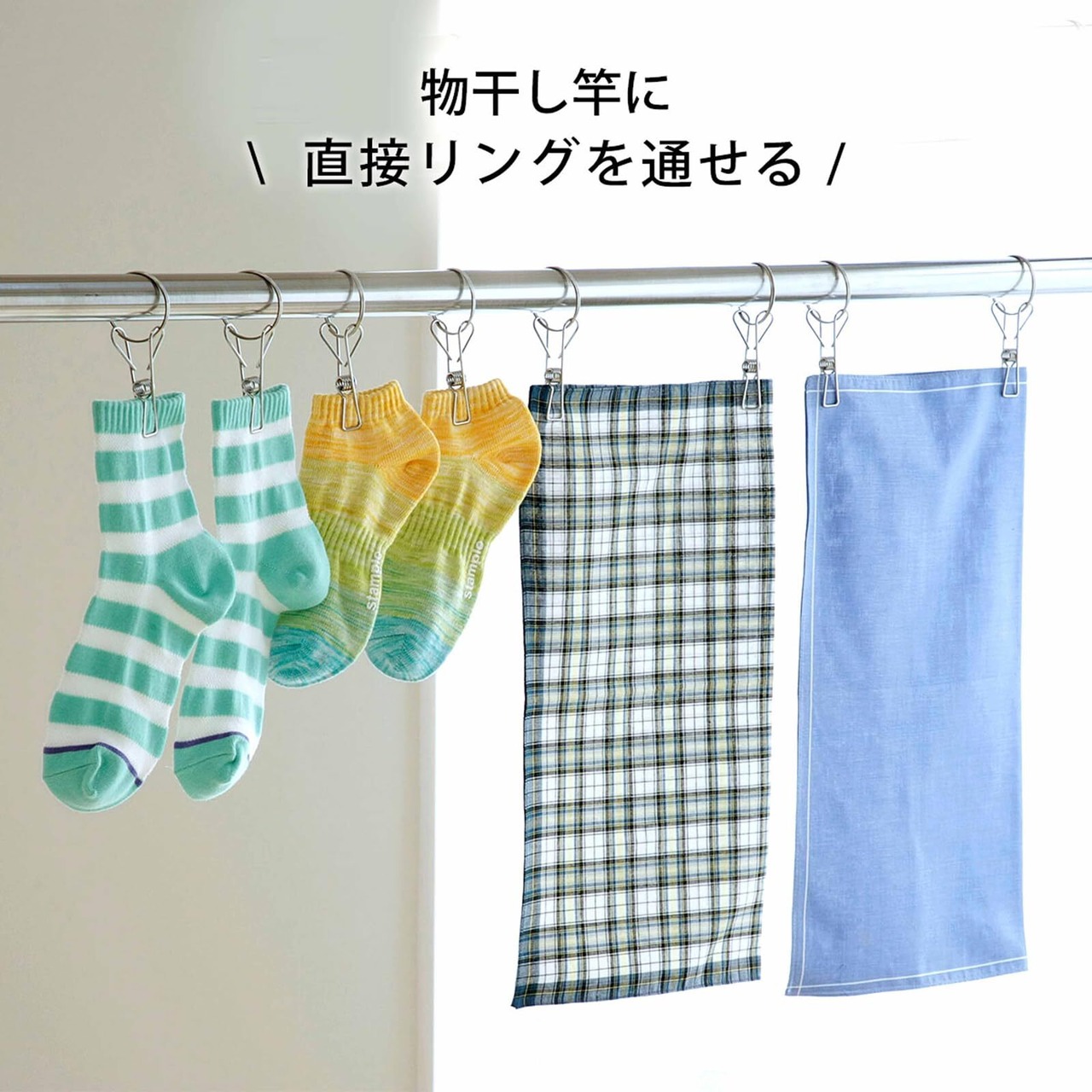 そのまま物干し竿に取り付けて使用。小物干しに便利