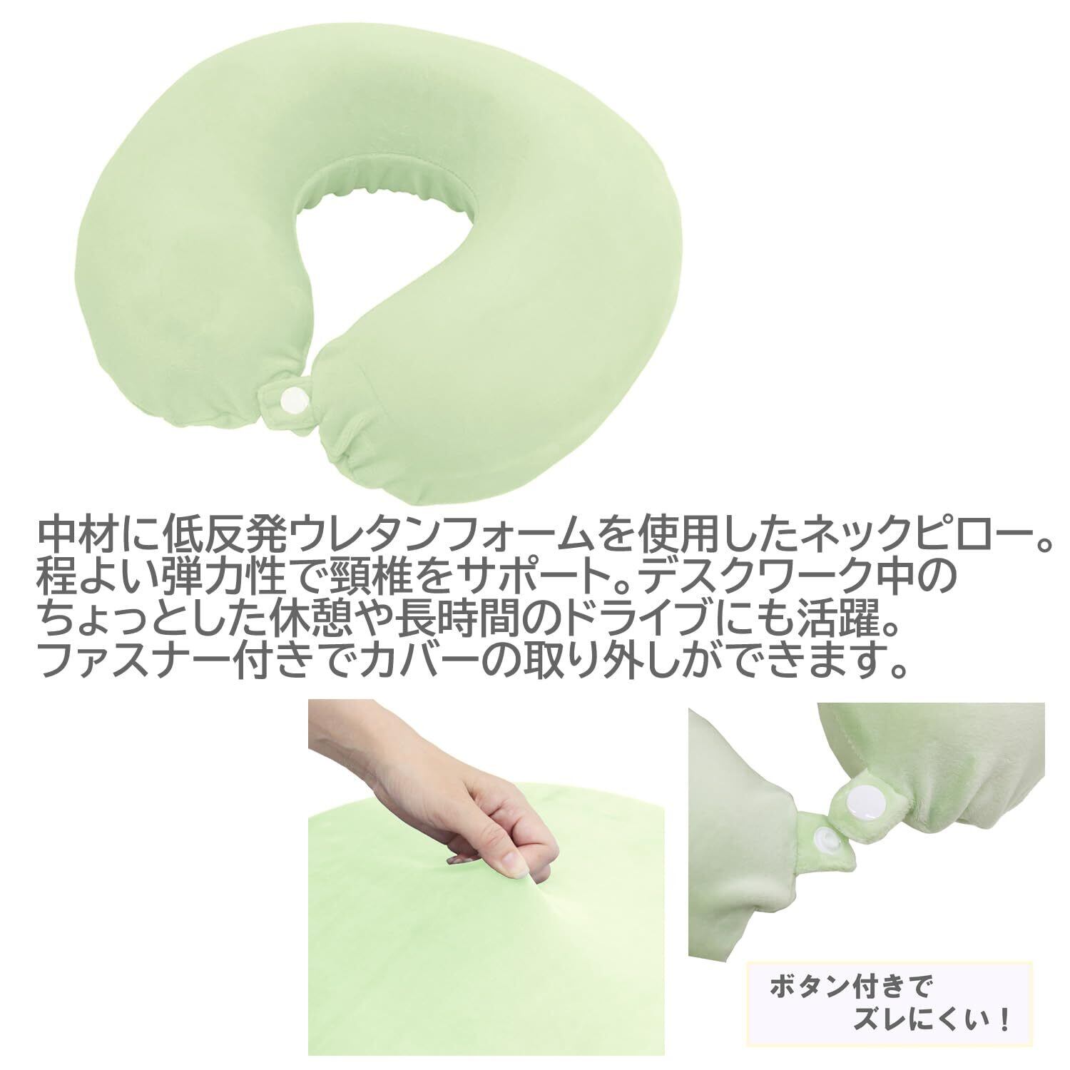 中材に低反発ウレタンフォームを使用したネックピロー。程よい弾力性で頸椎をサポート。デスクワーク中のちょっとした休憩や長時間のドライブにも活躍。首元にボタン付き、使用中にズレにくくなっています。持ち運びに便利なコンパクトサイズ。ファスナー付きでカバーの取り外しができます。カバーは洗濯可能。整髪剤やメイクのうつりなど…汚れが気になる時 洗えて清潔に使用できます。