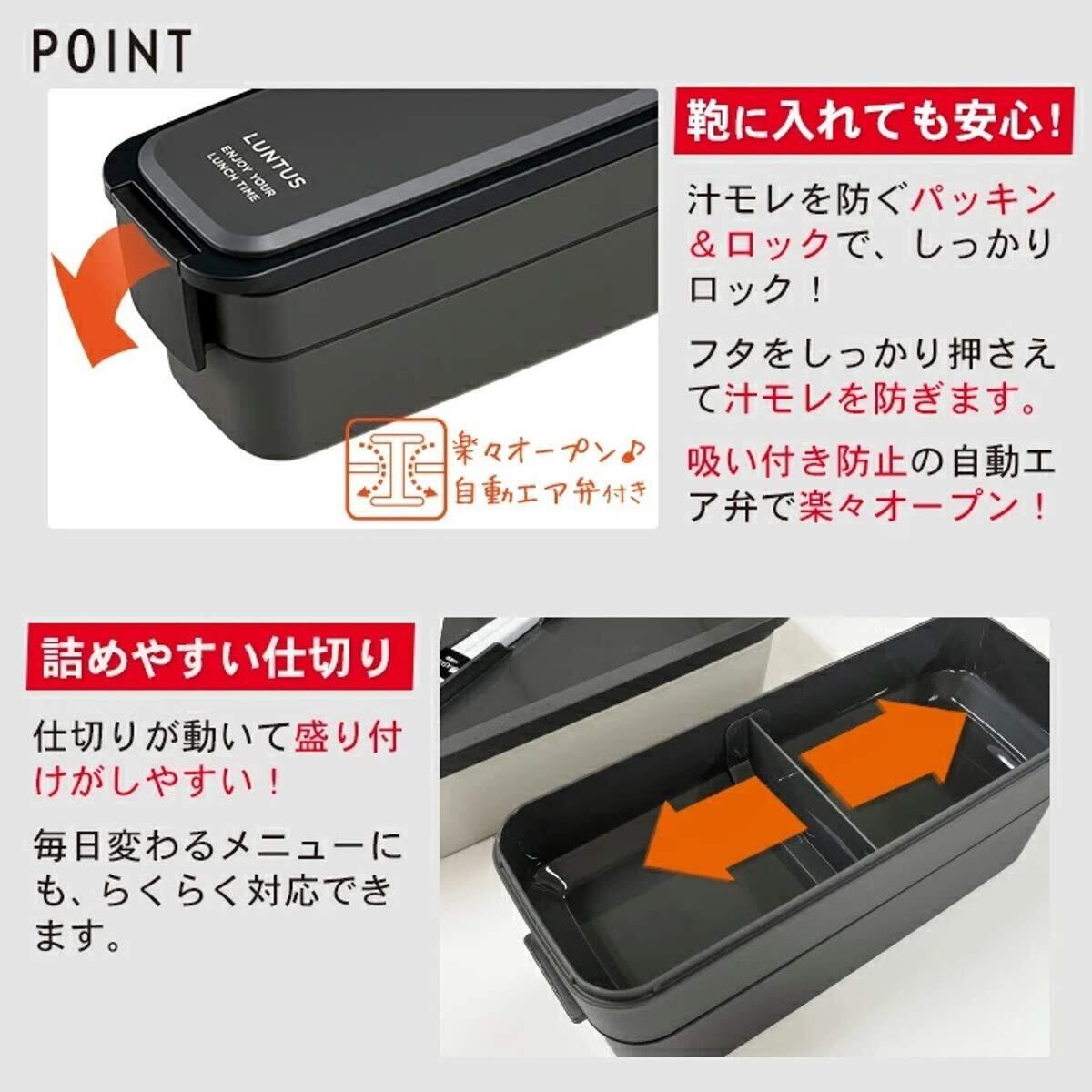 資材:箸フタ/ABS樹脂、上容器フタ・箸/AS樹脂、上容器・下容器・仕切り・止め具・弁本体・下容器フタ/PP、パッキン・弁/シリコーンゴム、ランチバッグ/ナイロン、ベルト(バッグ用)/ポリエステル・ゴム・ナイロン