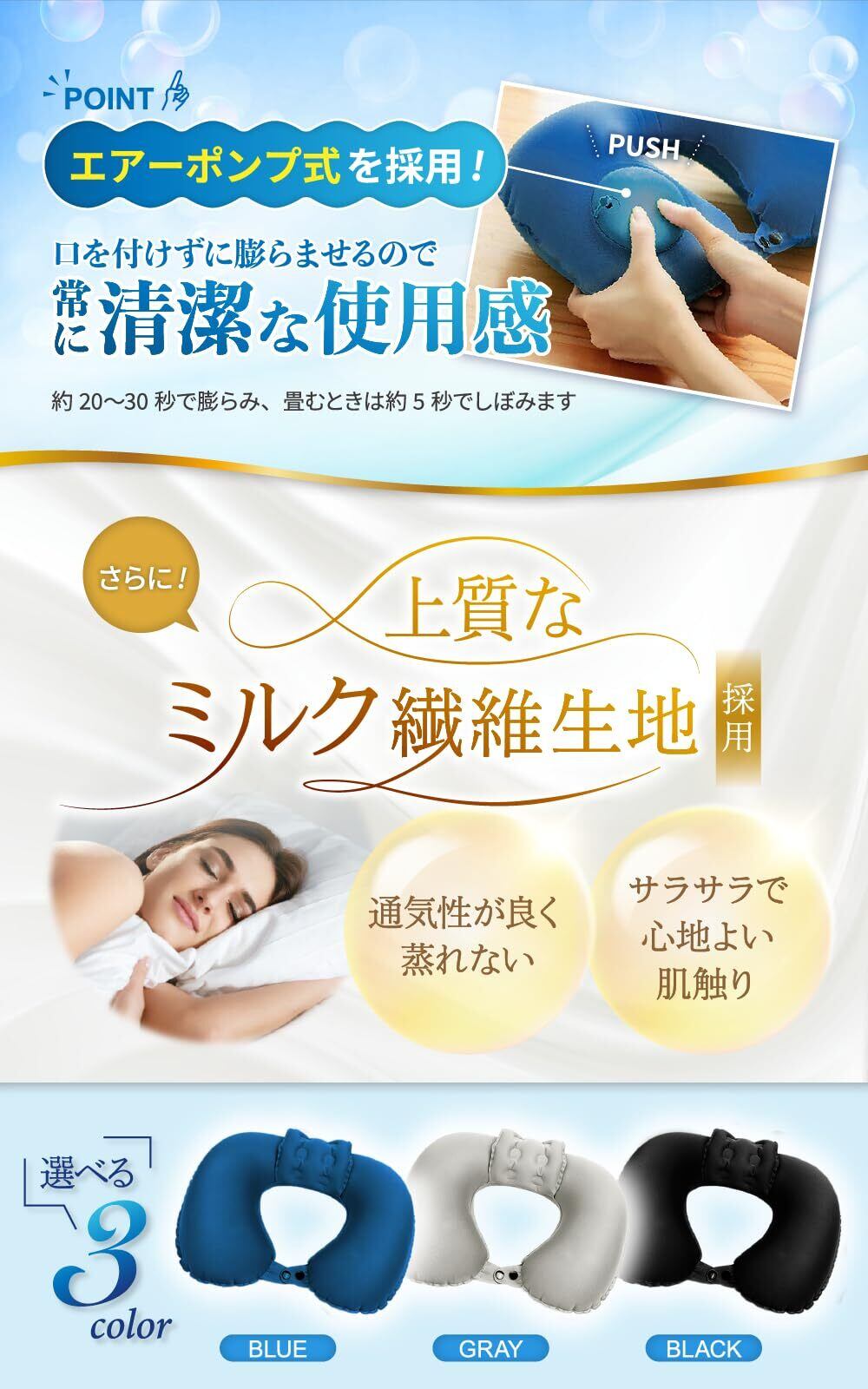 【サイズ調整自由自在】従来のクッション型ネックピローではサイズ調整が不可能で、中々自分の体型に合わず、逆に首に負担がかかることも...。当商品は『空気ポンプ式による本体サイズの微調整』+『ボタンでの締め具合3段階調節』でより細かな微調整が可能に!様々な体系の方にピッタリフィットします。