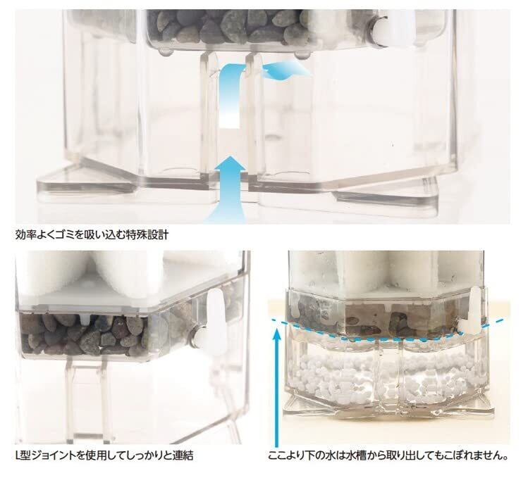1.本体部分をつかみ、できるだけまっすぐに水槽から取り出し、バケツやトレーなどの容器に移してください。その際に本品内部のパイプ部分より上の水はこぼれますのでご注意ください。2.L型ジョイントを引き抜くと、本品を取り外すことができます。3.本品に溜まったゴミを捨ててから再セットしてください。