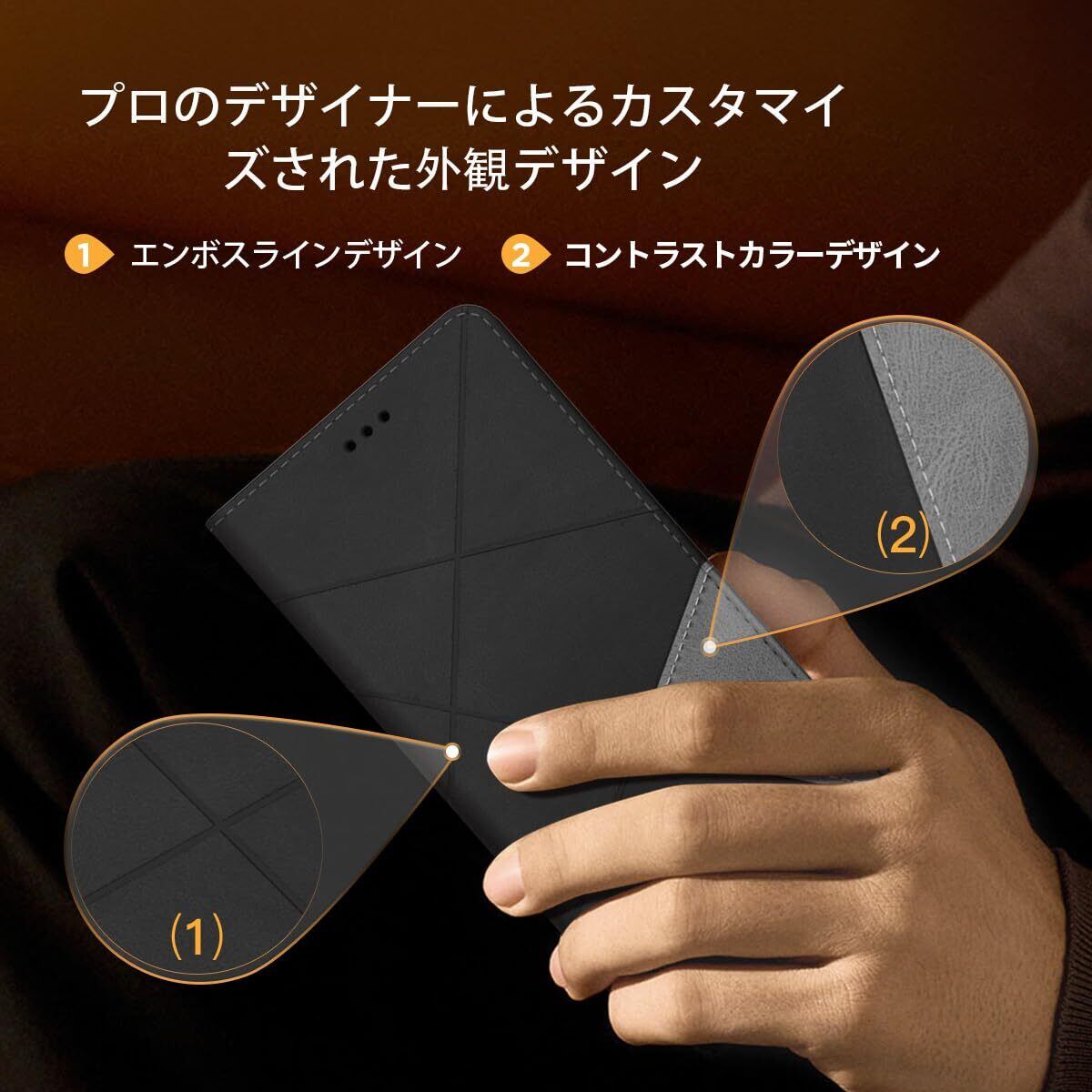 【プロのデザイナーによるデザイン】fagazzfuのデザイナーは常にシンプルでファッショナブルなデザインコンセプトを貫いています。シンプルなコールドプレスラインのデザインは、革をより立体的かつ触感的にすることができ。三角形のコントラストカラーデザインで単調にならず、メインカラーと干渉しません。シンプルなデザインで、誰もが異なるファッションと美しさの感覚をもたらします。ストラップホールも付いておりますので、お好みの装飾に合わせてご利用いただけます。組み合わせて自分だけのスマホケースを作りましょう。