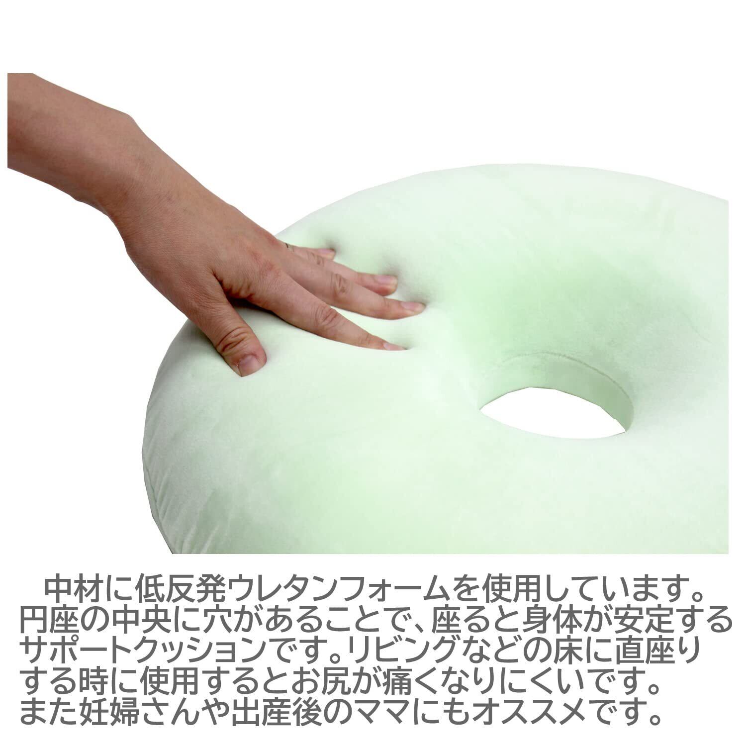 中材に低反発ウレタンフォームを使用した円座クッション。円座の中央に穴があることで、座ると身体が安定するサポートクッション。
