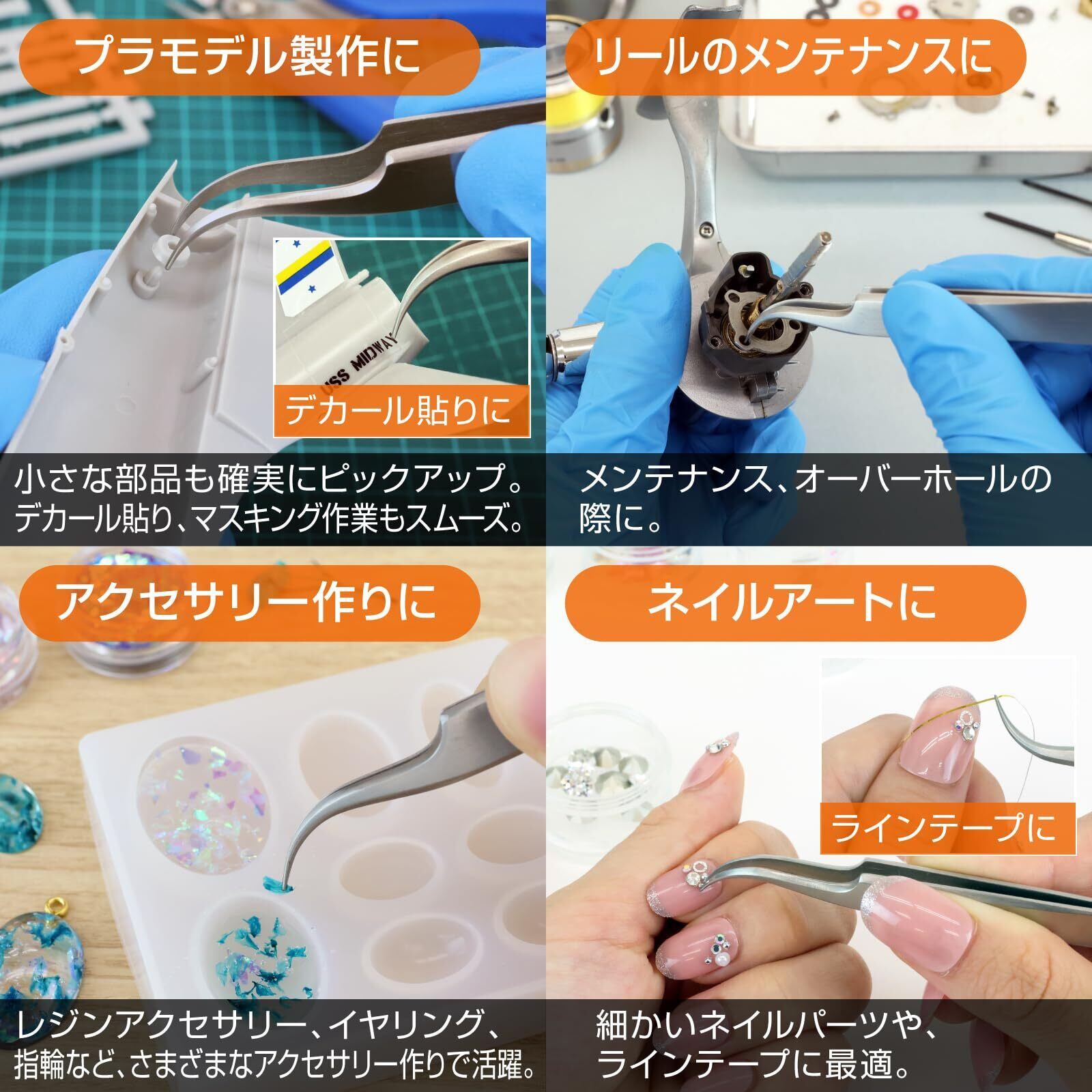 【幅広い用途に対応】 ネイルアートやまつエクなどの美容関係はもちろん、プラモデルやデコブロック、ビーズ制作、さらにはキャラ弁作りなど、趣味の領域でも幅広く活躍します。また、入学・入園準備の名前シール貼りや、介護施設での持ち物への名入れ作業、習い事用具の整理など、生活シーンにおける実用性も高いのが特徴です。小さなシールや細かい部品を指で掴みにくいときに、スムーズに正確に扱えるため、家庭でも職場でも役立つ万能ツールとしてご利用いただけます。