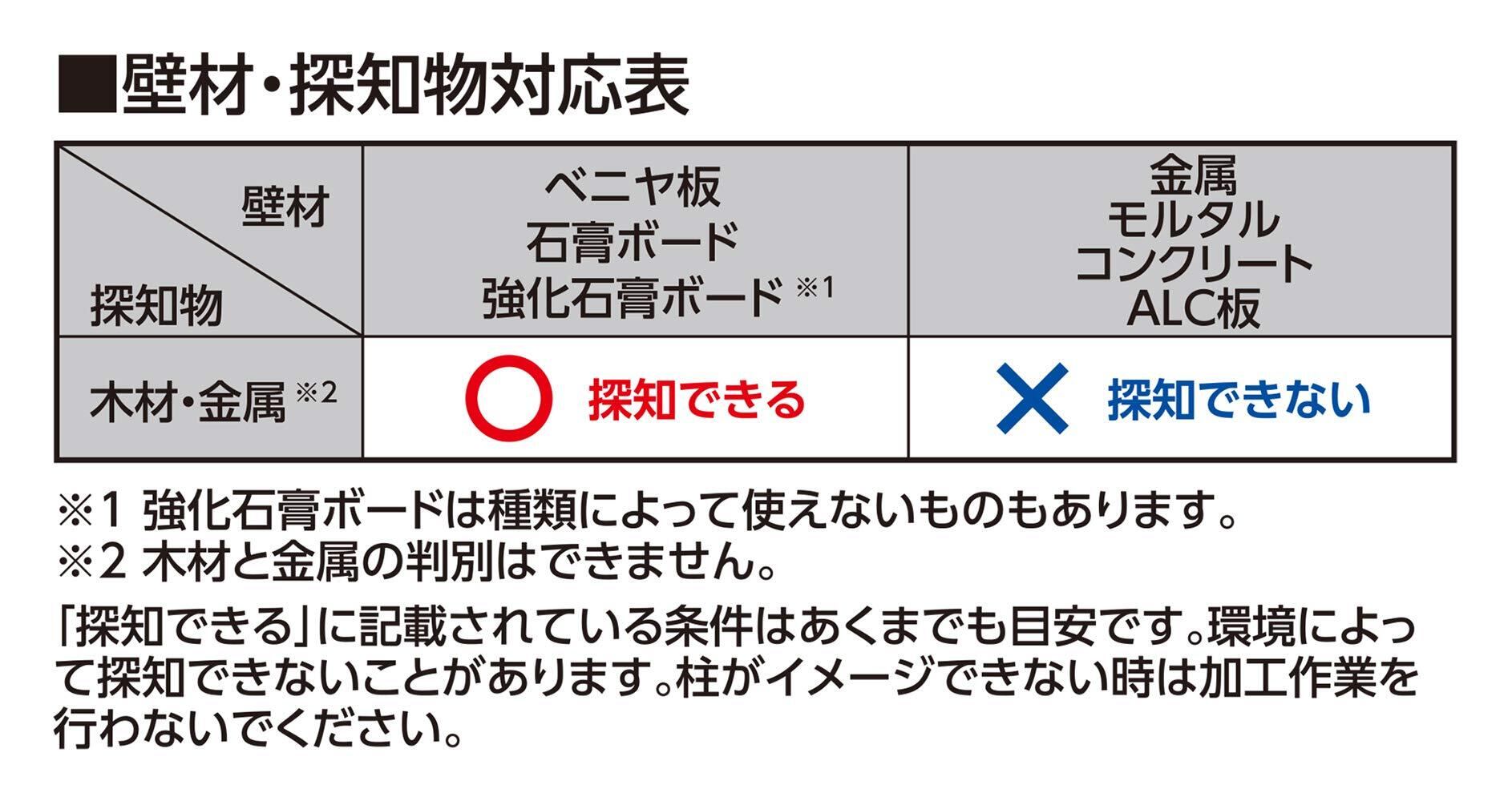探知可能下地材:木材・金属 ※木材と金属の判別はできません 厚み:35mmまで