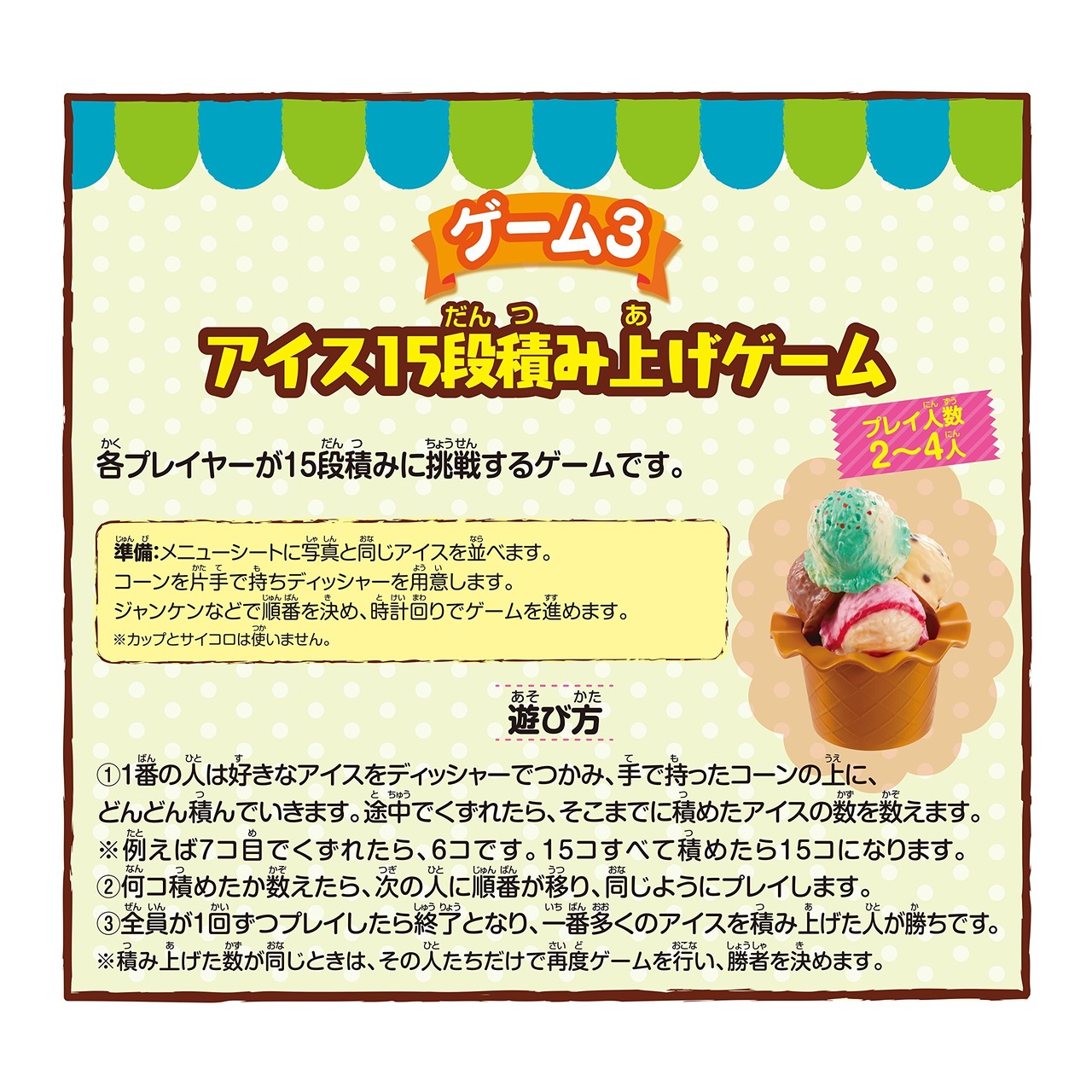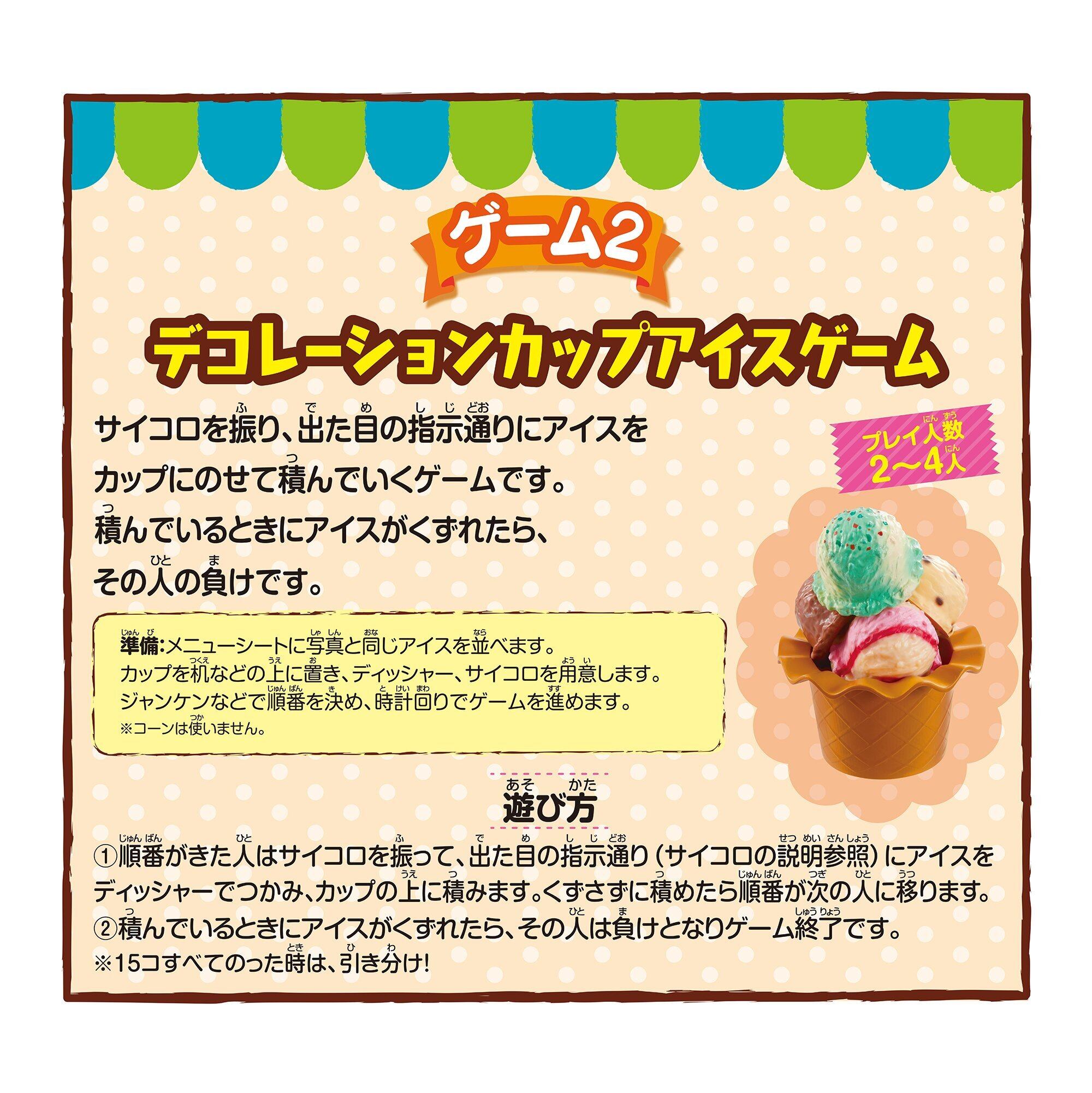 大小合わせて15コの可愛いアイスを使って、3つのゲームが楽しめます! サイコロの指示どおりに