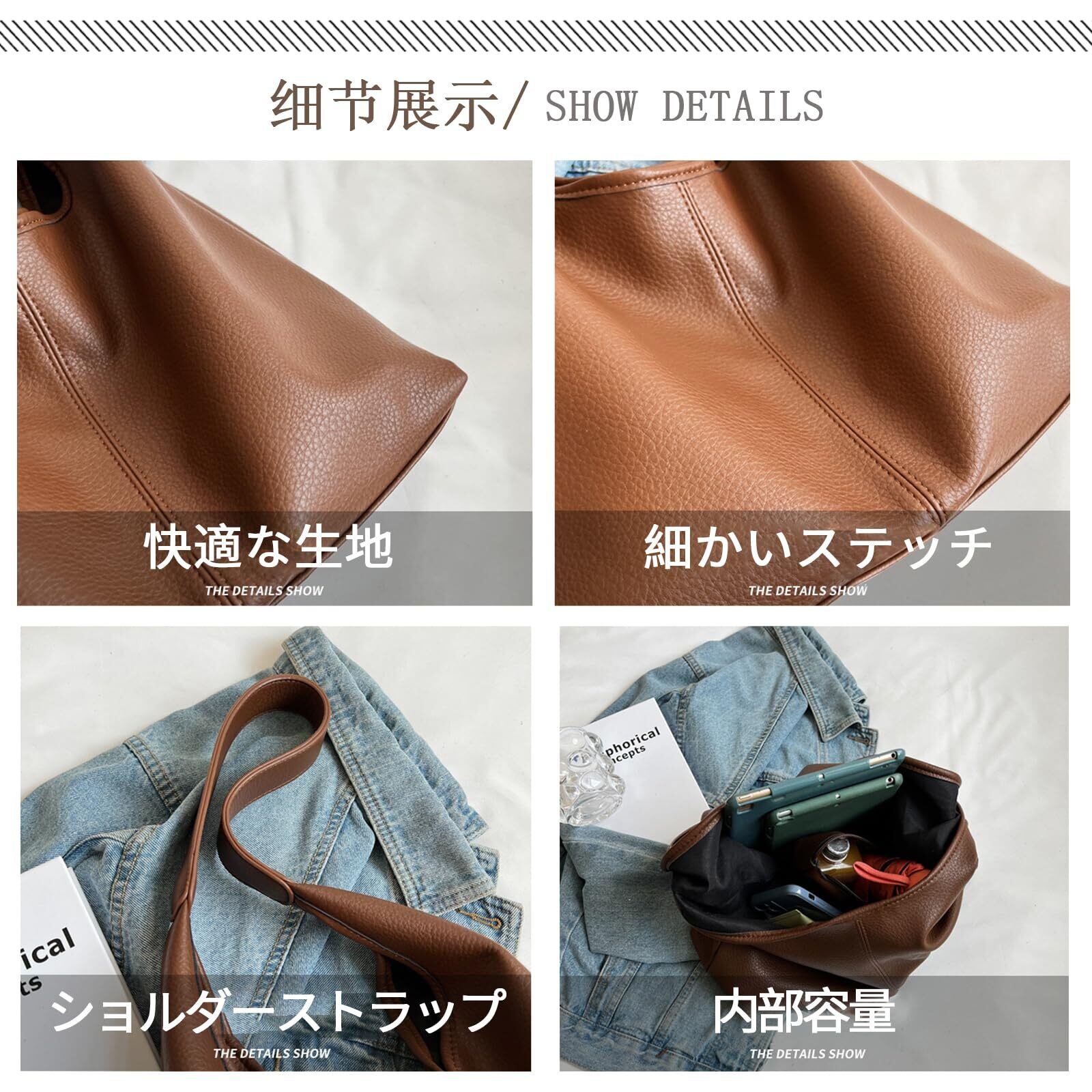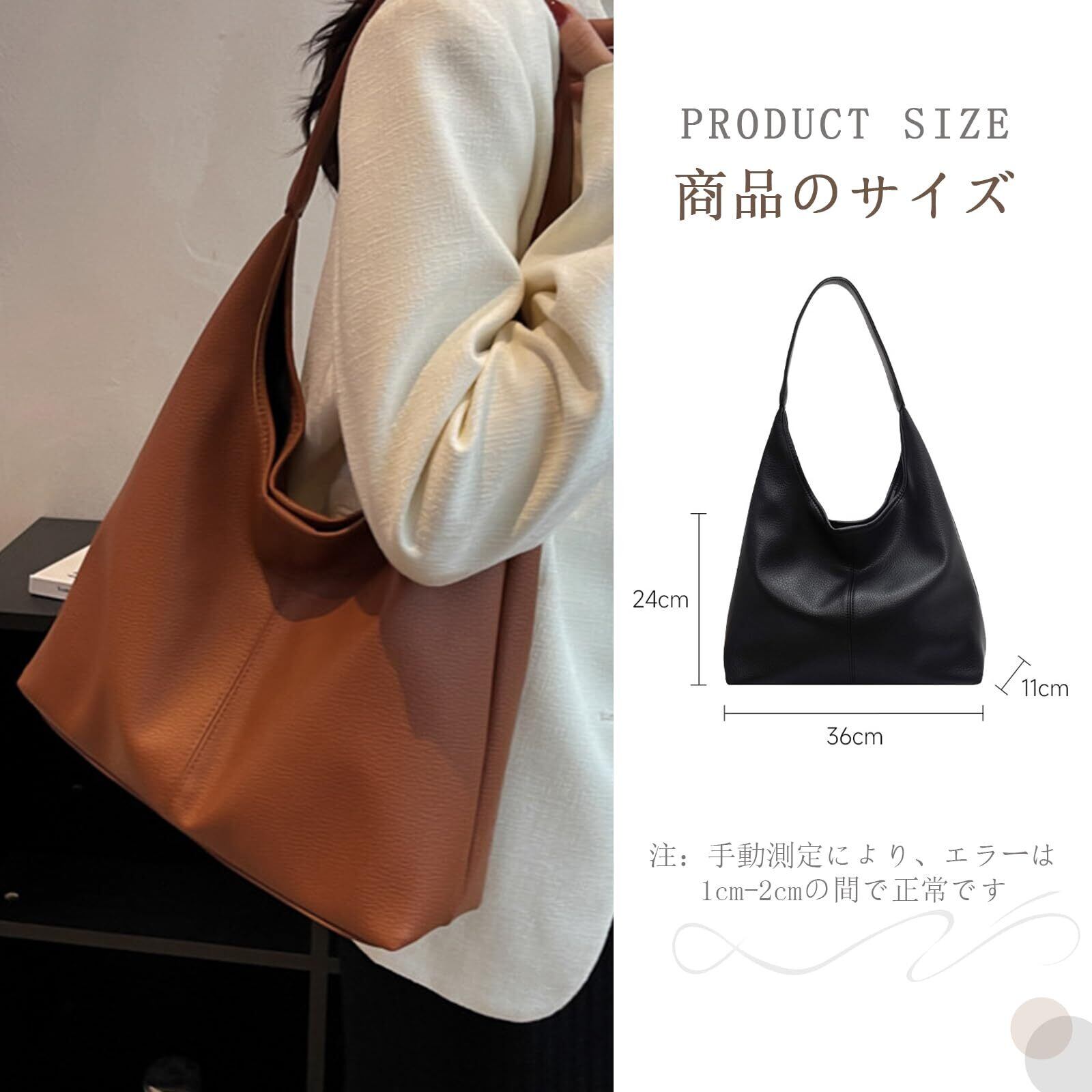 【製品仕様】サイズ:幅35cm×高さ(中央)24cm×厚さ11cm、ハンドル長さ33cm、重量0.3kg。カラーはブラックとコーヒーの2色からお選びいただけます。軽量で機能的なデザインは、日常使いから旅行まで幅広い用途に対応します。 【上質な素材】高品質のPUレザーを採用したショルダーバッグ レディース トートバッグは、優れた耐久性と撥水性を兼ね備えています。汚れや水滴がついても、サッと拭くだけで清潔を保てる手軽さが魅力です。柔らかな手触りで高級感を演出し、日常使いに最適です。 【快適で軽量なデザイン】重さはわずか0.3kgで、肩への負担を軽減します。通勤、通学、お買い物など長時間の持ち運びでも疲れにくい設計です。また、33cmのハンドルは肩にかけたり手に持ったりと、シーンに合わせて自由に使いこなせ、快適な使用感を実現しています。 【大容量、たっぷり収納】A4サイズの書類、タブレット、折り畳み傘、財布、化粧ポーチ、スマホなど日常の必需品が楽々収納できます。見た目以上に収納力があるので、ちょっとしたお買い物や通勤・通学にも最適で、お出かけの時はバッグ一つで済みます。 【スタイリッシュで幅広い用途】 シンプルながらエレガントなデザインは、通勤、通学、デート、ショッピングなどあらゆるシーンにぴったり。年齢や服装を問わずコーディネートしやすいバッグで、プレゼントとしても喜ばれる一品です