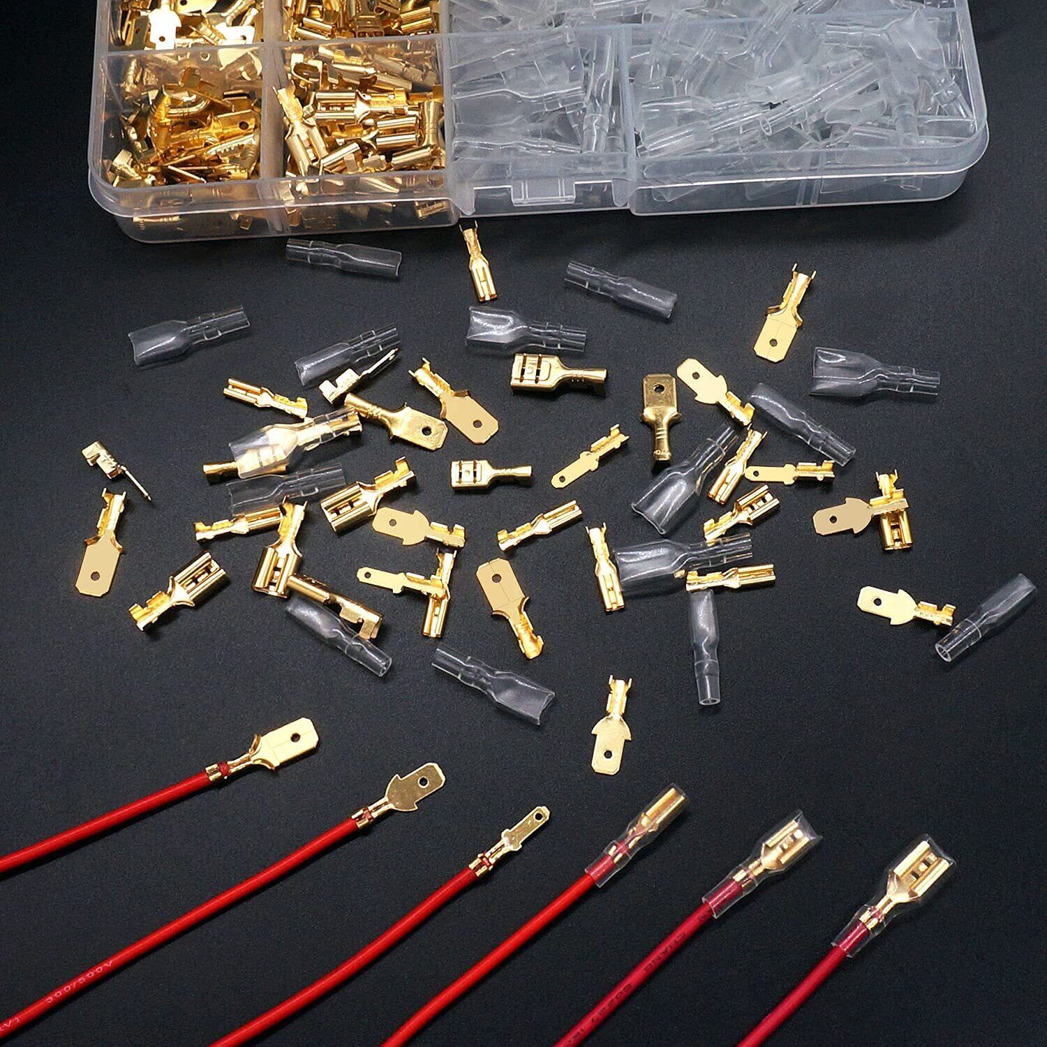 aninako ギボシ端子 270個セット オス/メス対応 絶縁スリーブ付き 6.3mm/4.8mm/2.8mm 平型端子 金色 防水加工 自動車/バイク用 圧着端子 配線接続 収納ケース付き (270pcs 金色オス/メス セット)