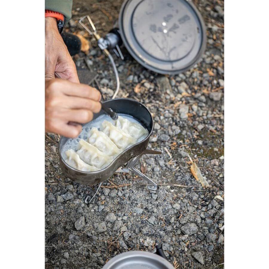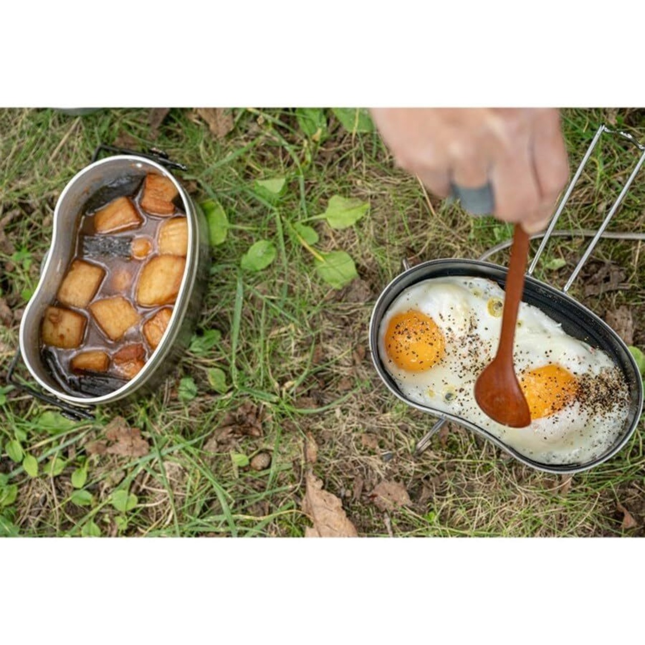 飯盒にフィットする焦げ付きづらいフライパンとして、携行しやすい変形フライパンとして新たな提案です。