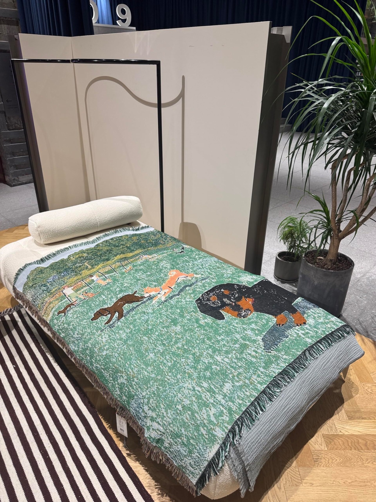 チャームポイント◆ ・愛らしいダックスフントのイラストが散りばめられたデザイン ・落ち着きのあるベージュ基調でお部屋の雰囲気に馴染みやすい ・肌触りの良い素材使用で快適な使い心地