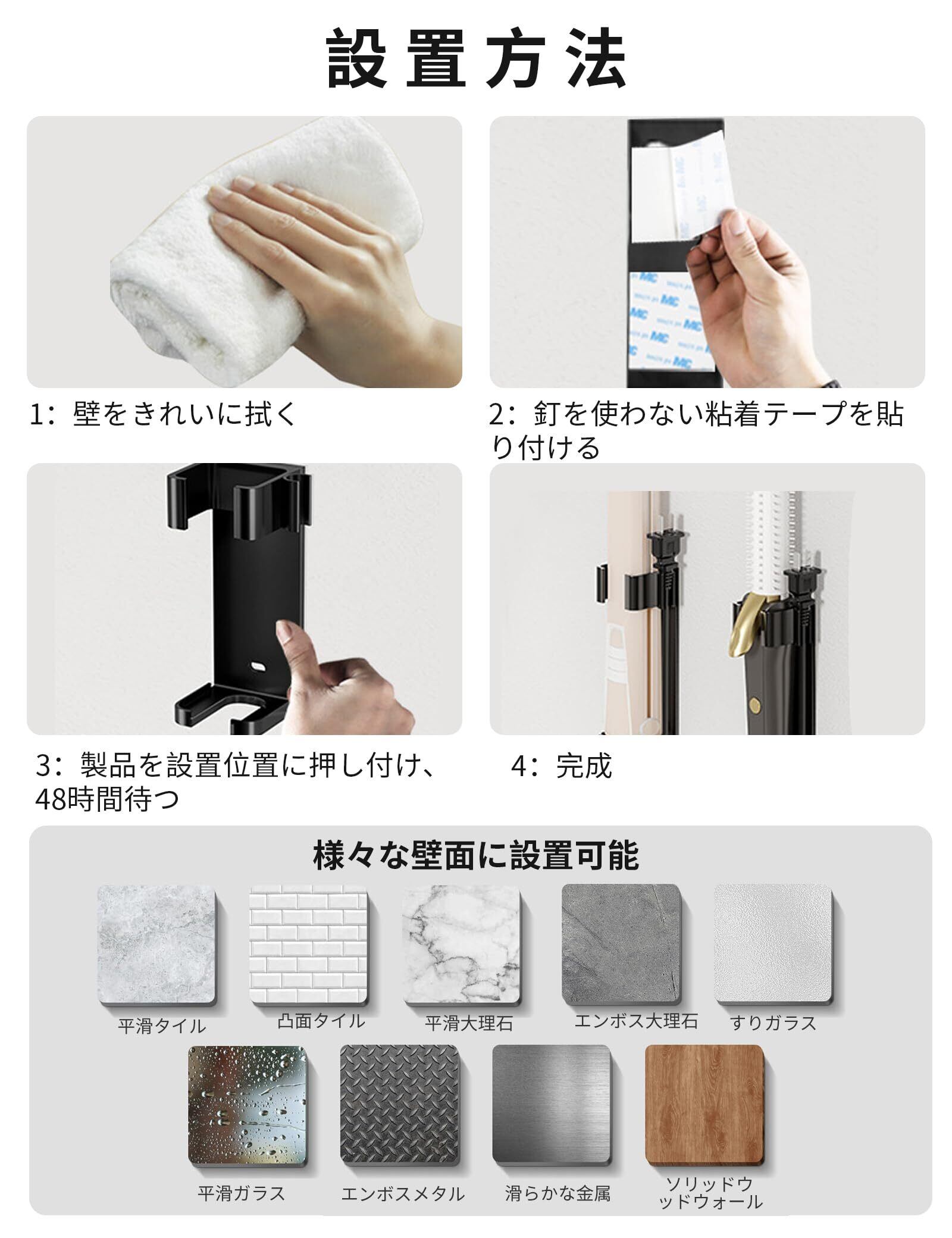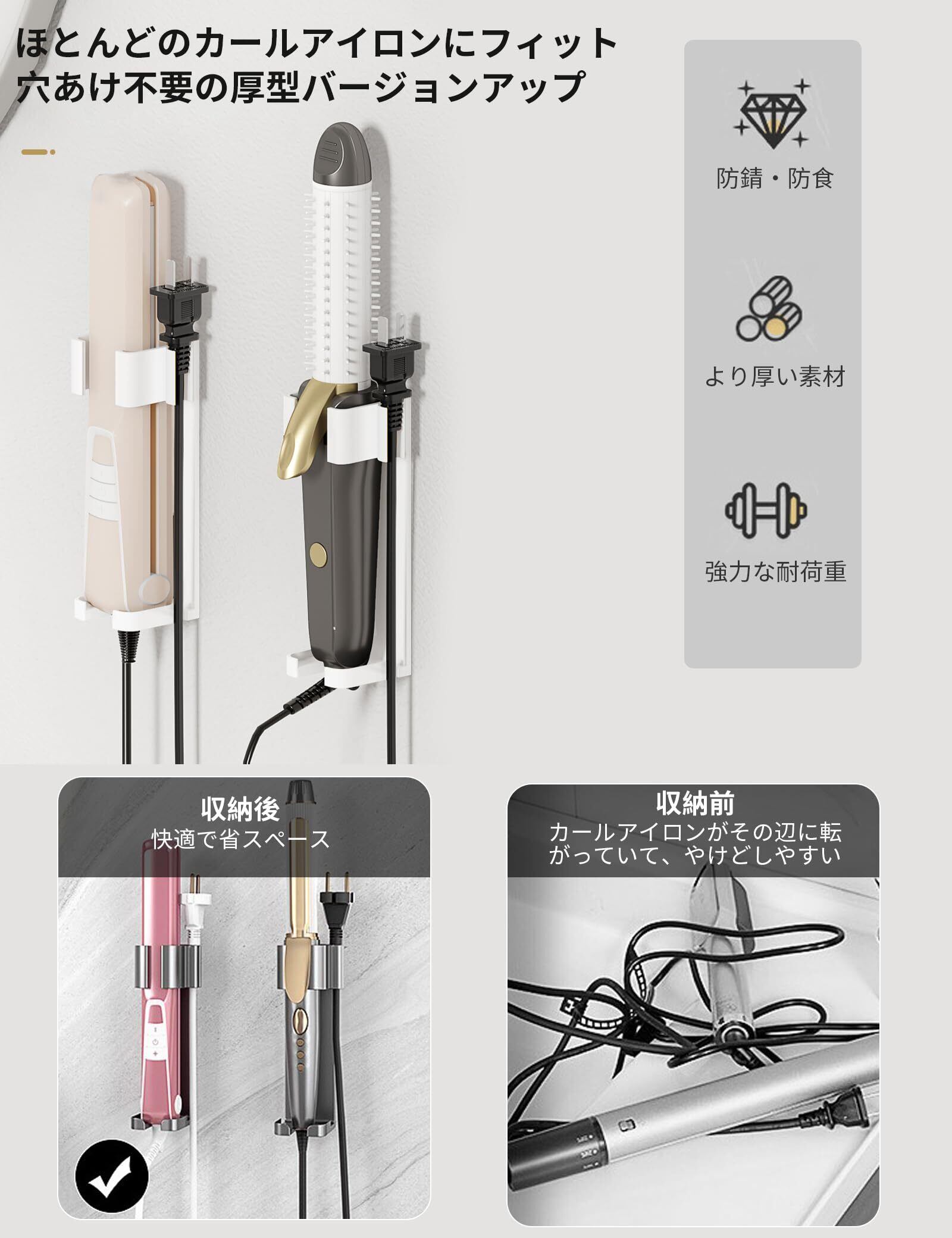 【簡単設置】穴あけ不要。 耐熱 ヘアアイロンホルダー、自己粘着性の壁取り付け、穴を開ける必要がなく、直接貼り付けるだけです。ご注意:粗すぎる表面には適していません。