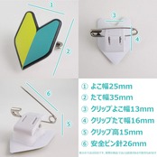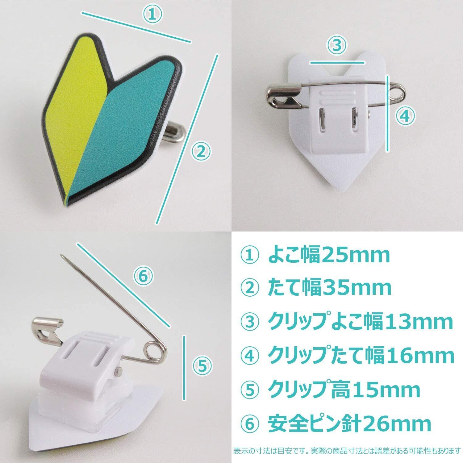 【素材】 発泡塩化ビニール2.0mm厚 360度回転クリップ材質…フレーム/スチール 打込ピン/真鍮 バネ/スチール レバー/ABS 台座透明部/PMMA 台座白色部/POM 安全ピン/スチール 【寸法】 本体:幅25mm×高さ35mm クリップ:幅13mm 厚み15mm クリップ込み厚み18mm 【商品説明】 会社やアルバイトなどの新入社員、新人スタッフ、研修中であることの目印に。 案内、受付、誘導、イベント、新人研修などにも好評です。 大きすぎないサイズ感なので主張しすぎず、さり気なくアピール出来ます。 また、ヘルメットやバイク本体には貼りたくないけど初心者だと周知してもらいたい方にも最適です。 裏面には安全ピン付きクリッキー付属。 クリップを使えばバッグやジャケットなどどこでも簡単に取り付け、取り外しが出来ます。 やわらかい素材で肌にあたっても痛くありません。 360度回転可能なのでポケットだけではなく襟など斜めになっている場所にもつけることが可能です。 ポケットに挟んだり肩の部分に装着してご使用頂けます。 【生産国】 日本