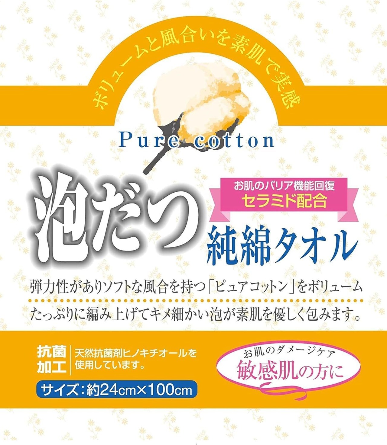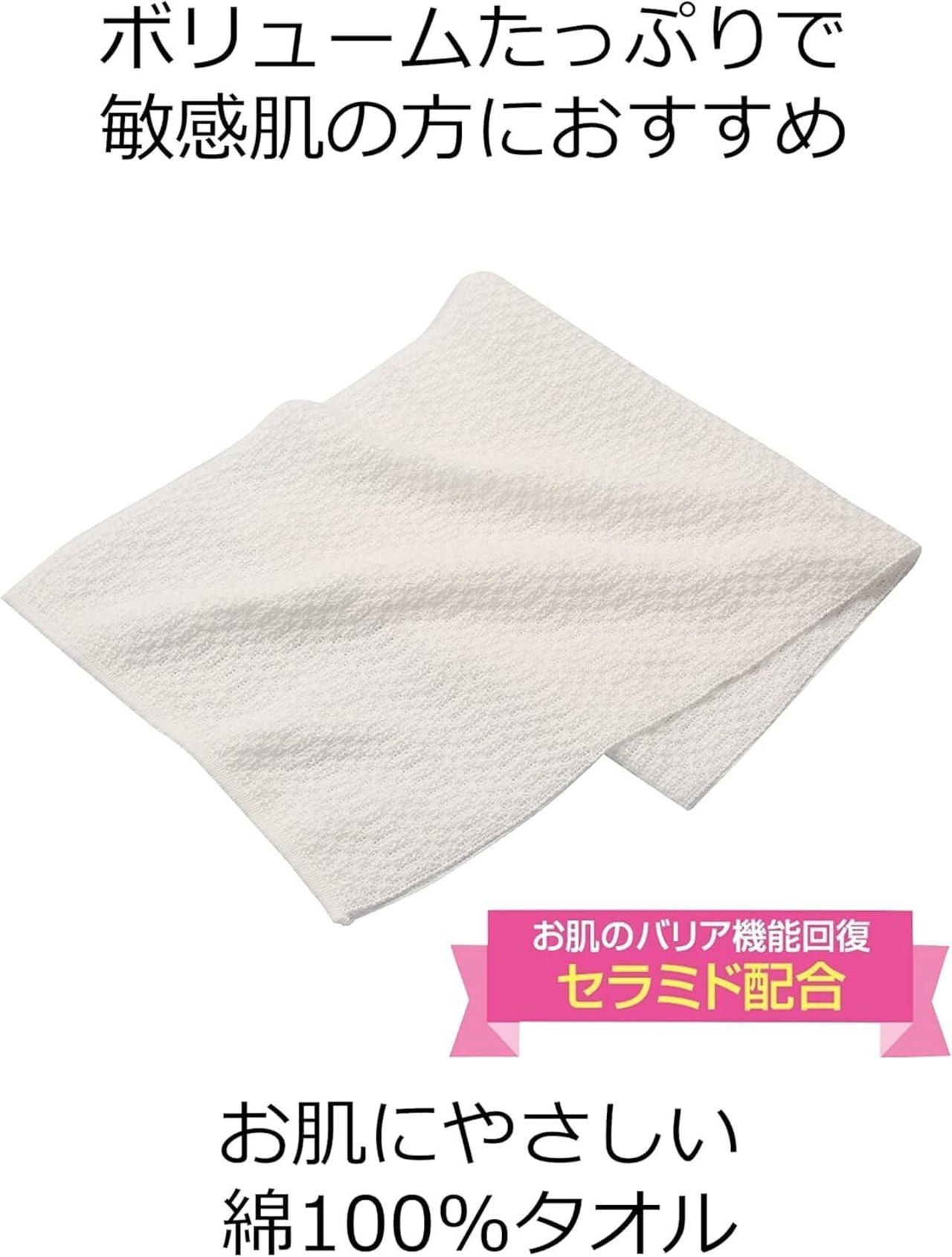 お肌に優しい綿100%タオルです。ボリュームたっぷりで敏感肌の方におすすめです。