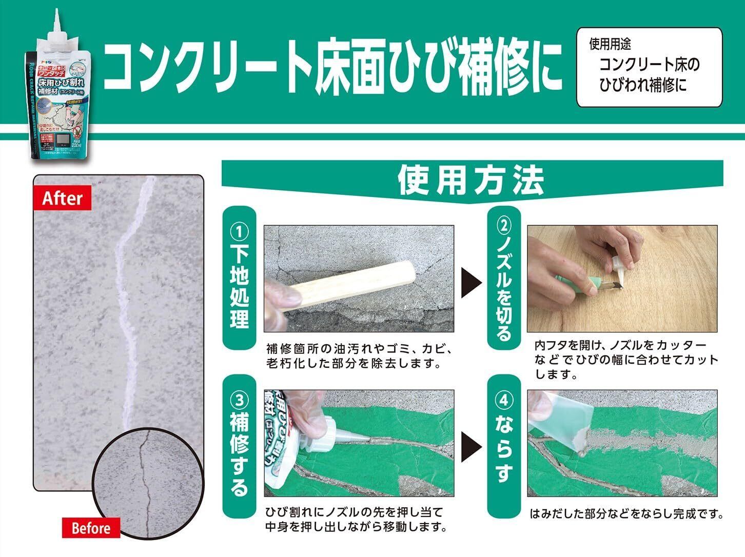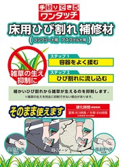 用途:屋内外のアスファルト水平床面のひび割れ(5mm幅以下)の補修に。※絶えず水がかかったり水につかるところや、いつも湿っているところには適しません。※カベ面には適しません。
