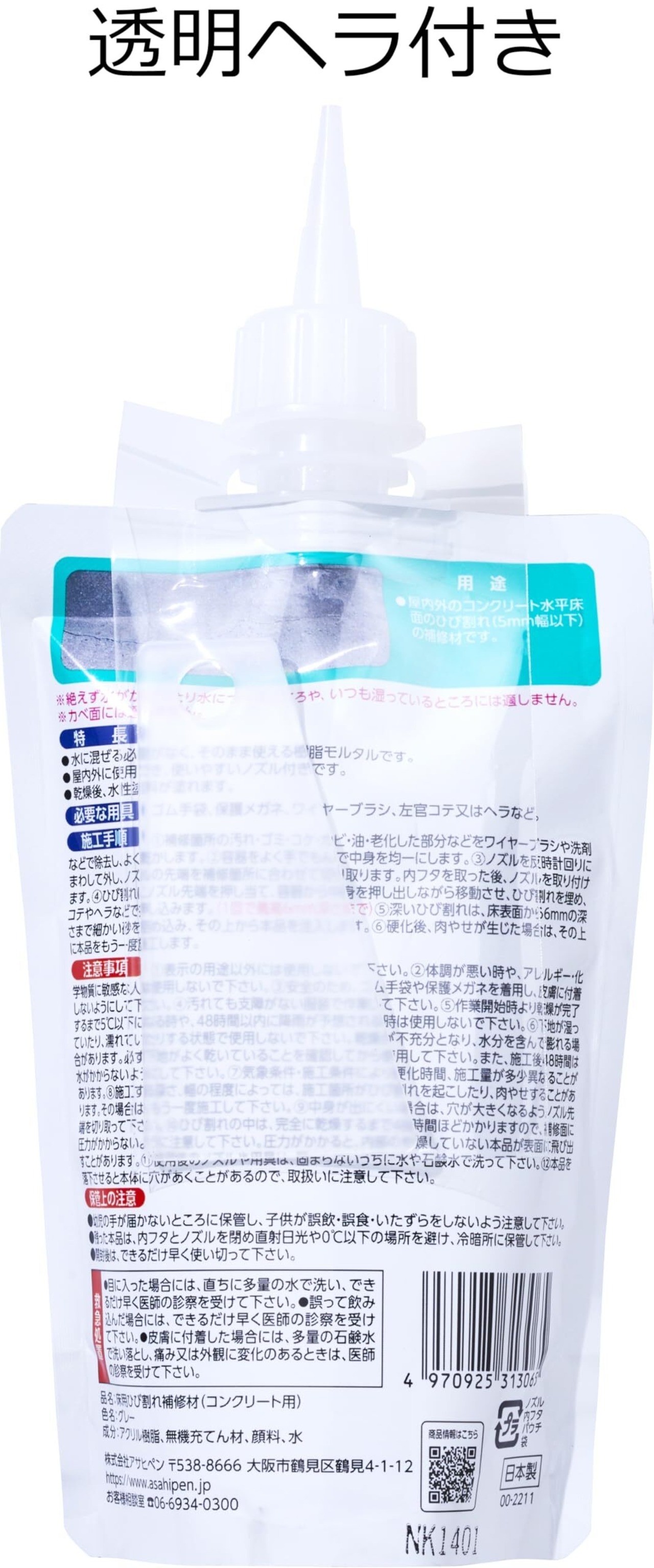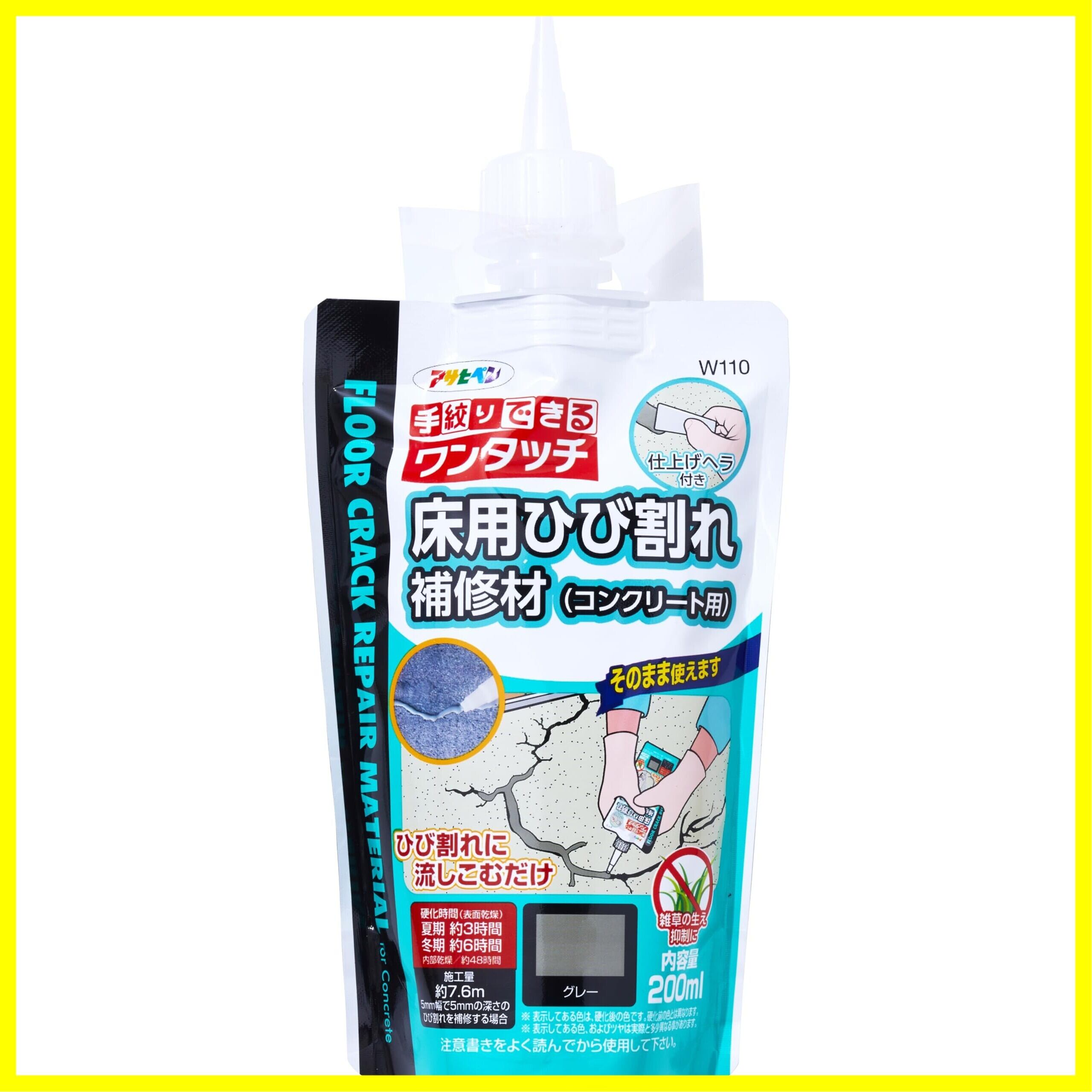 アサヒペン 充填材 コーキング材 ワンタッチ 床用ひび割れ補修材 コンクリート用 200ml W110 グレー 手絞りパウチ ヘラ付き 水混ぜ不要 塗料の上塗り可能 日本製