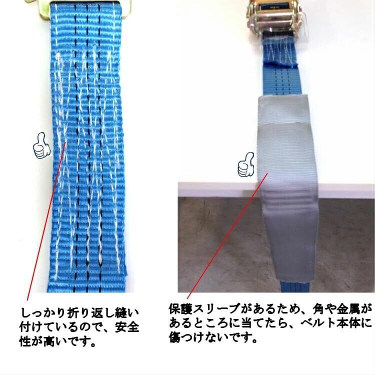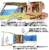 Uフックやアオリ穴からの荷物の固定に最適です。荷物にキズが付かないように、厚手のプロテクター付ラッシングベルト