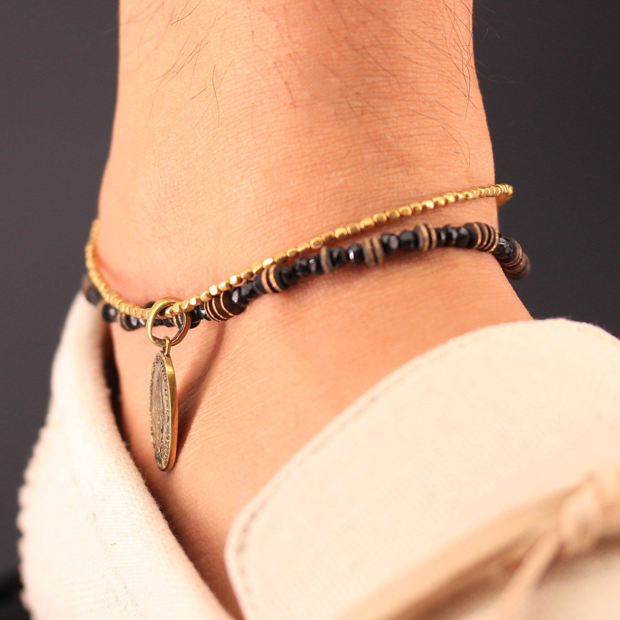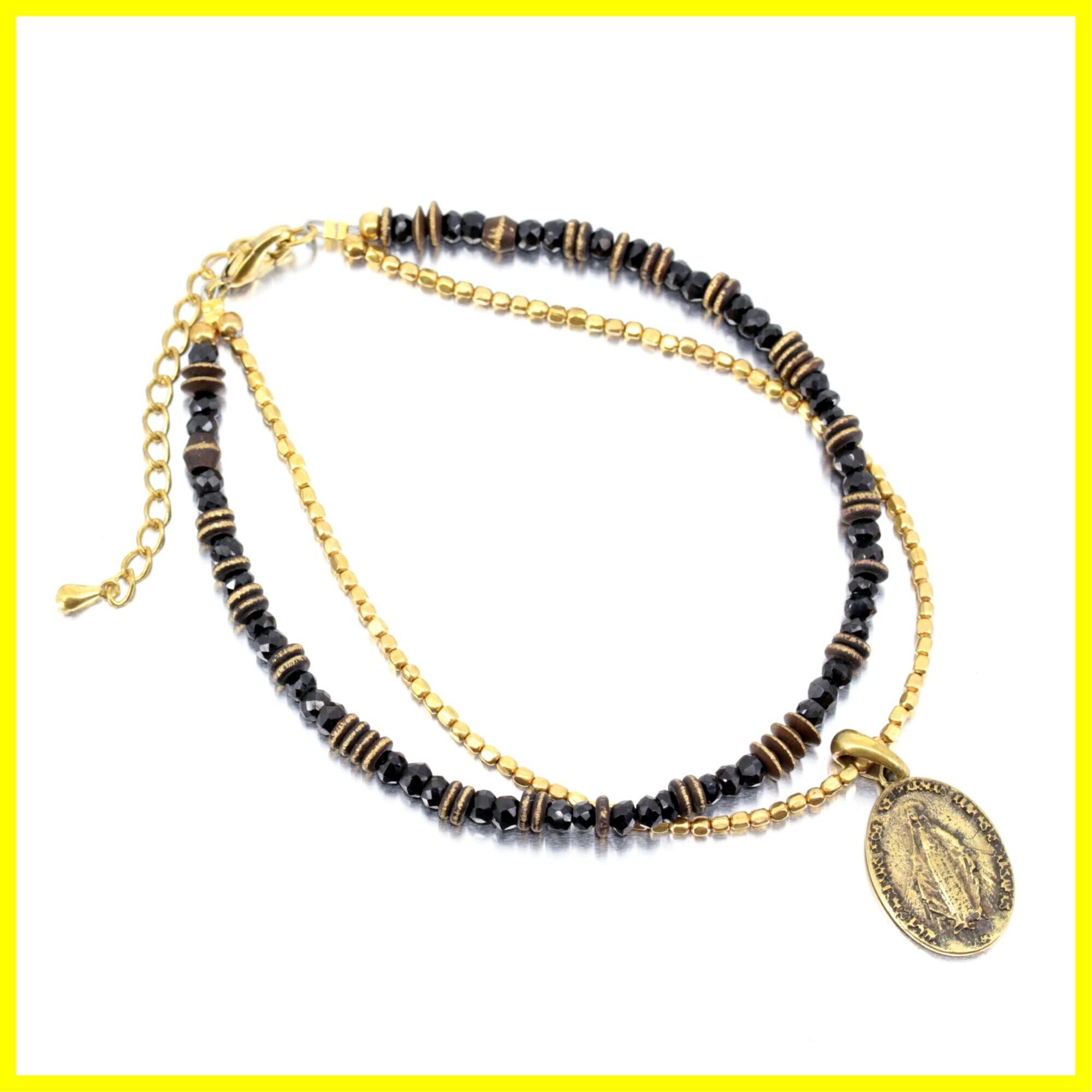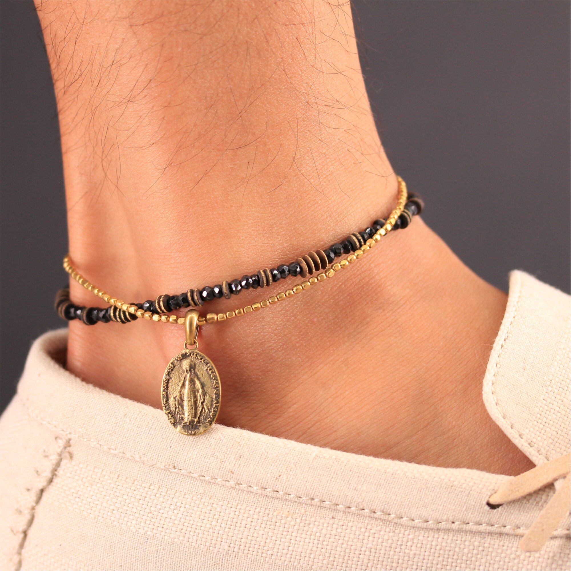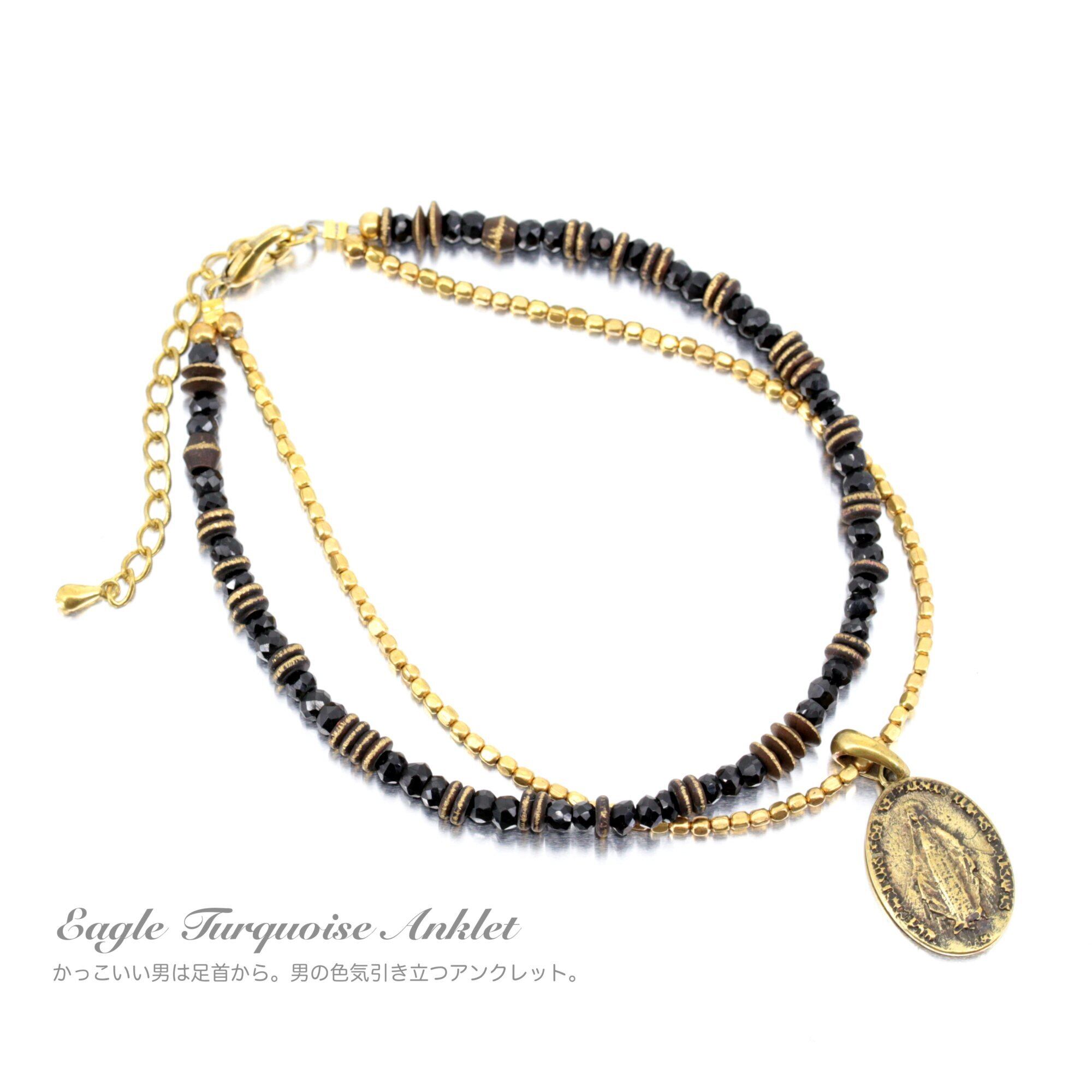 ocean アンクレット ブラック スピネル クロス マリア メダイ コイン ゴールド ブラス 足首 ミサンガ バングルメンズ