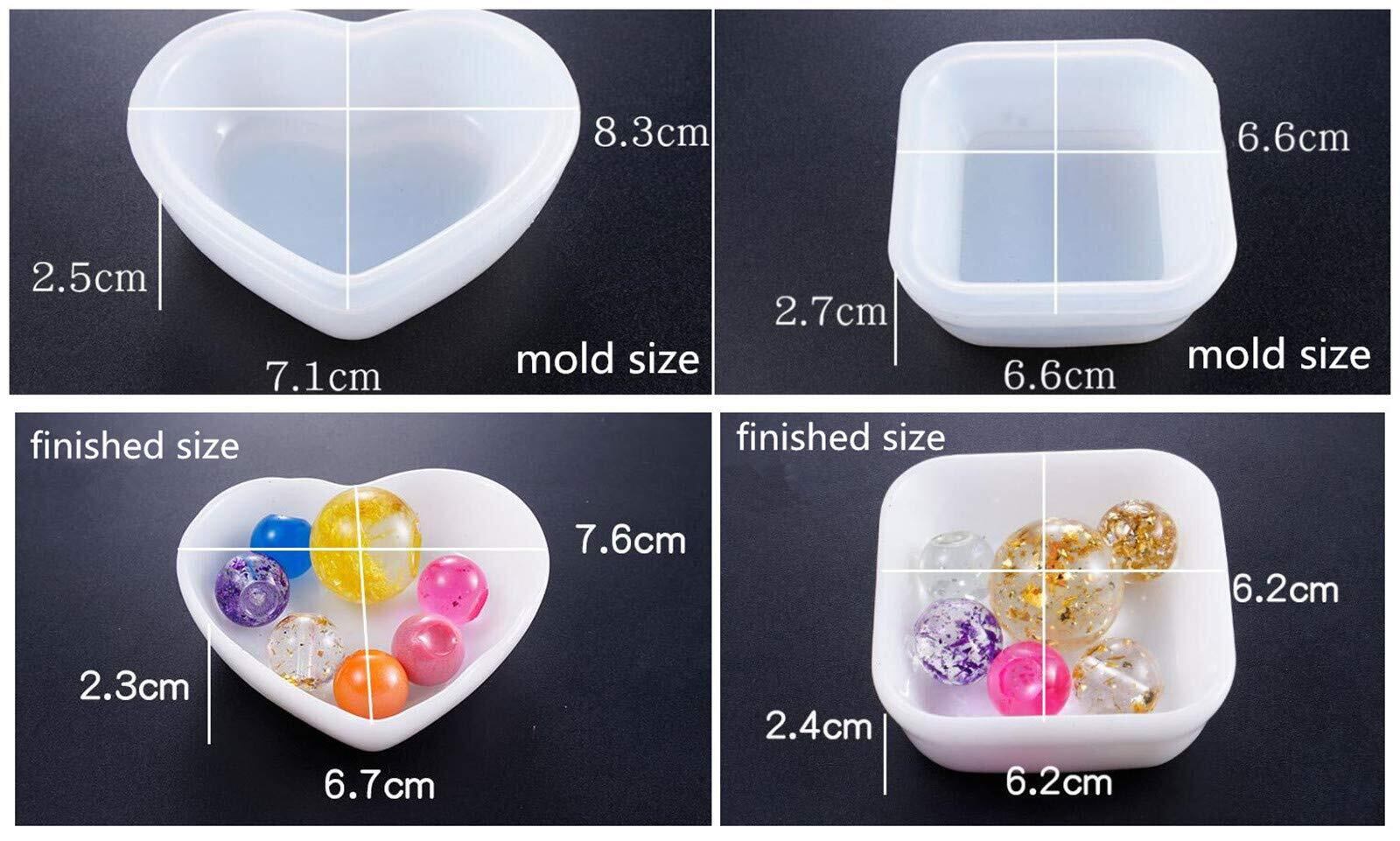 ハート:レジン型サイズ:8.3*7.1*2.5cm 出来上がりサイズ:7.6*6.7*2.3cm 四角形:レジン型サイズ:6.6*6.6*2.7cm 出来上がりサイズ:6.2*6.2*2.4cm