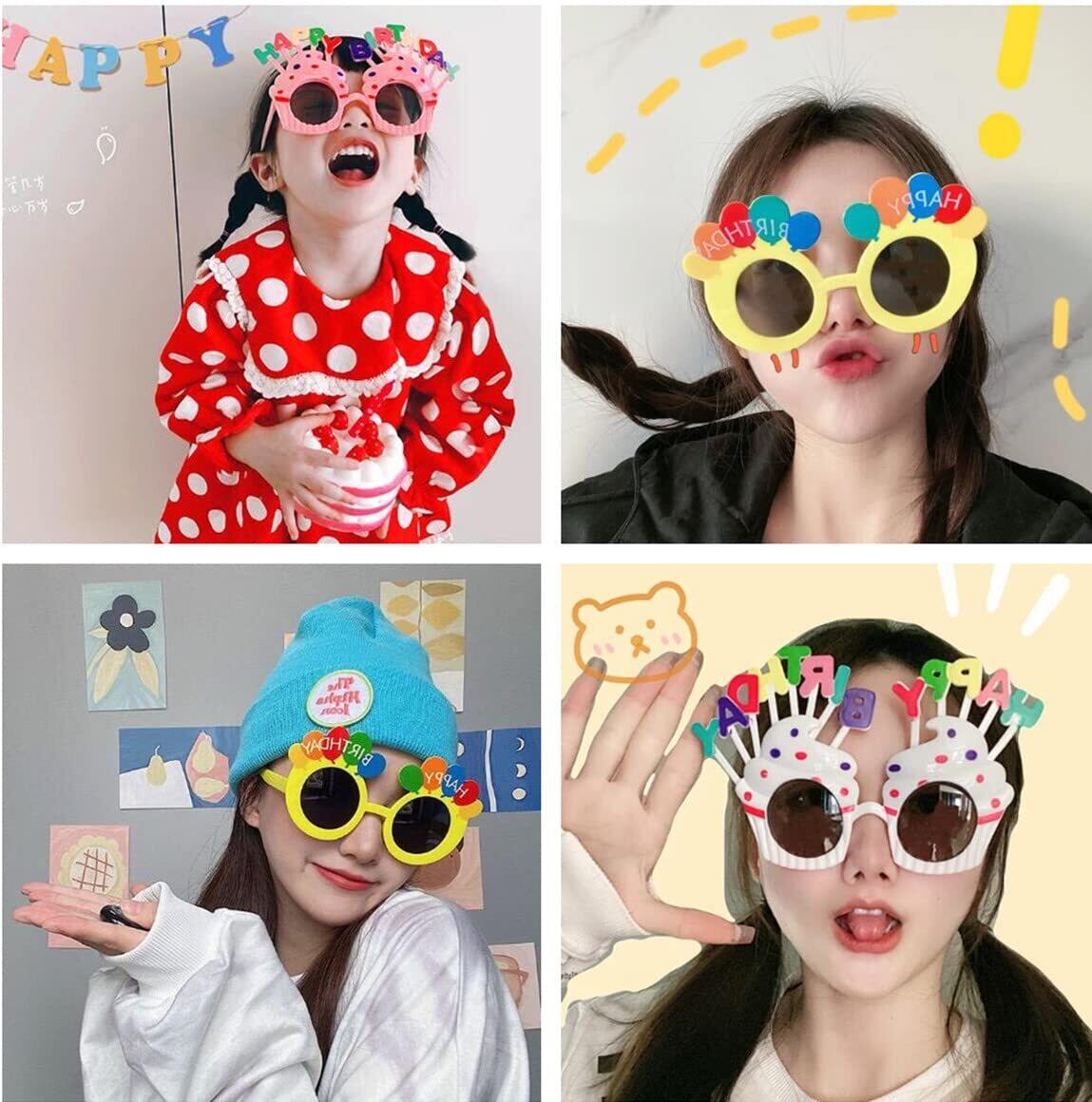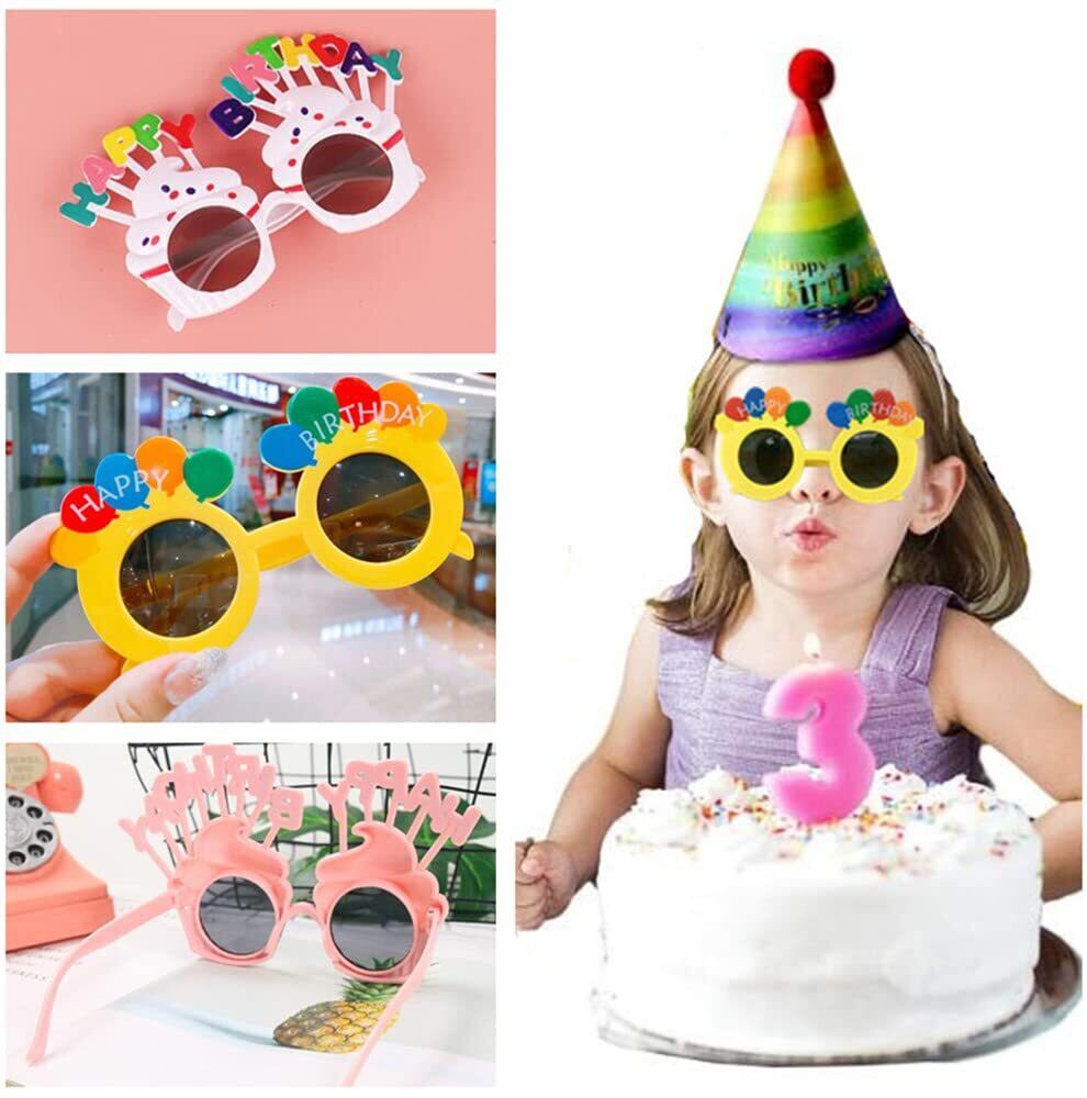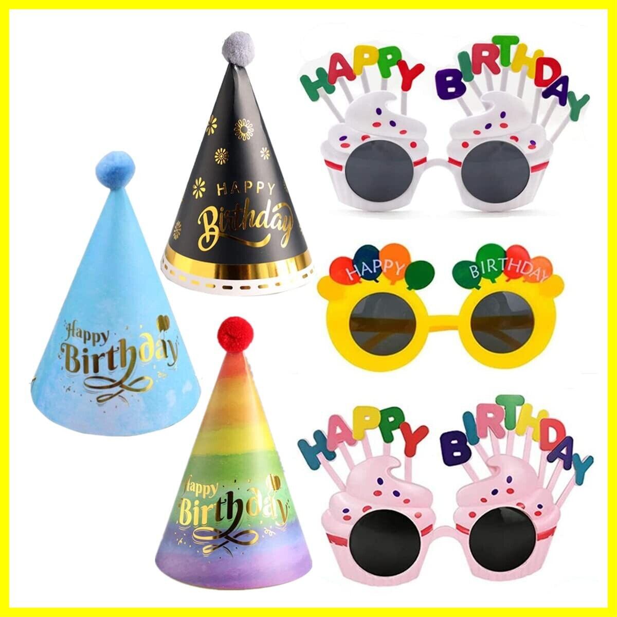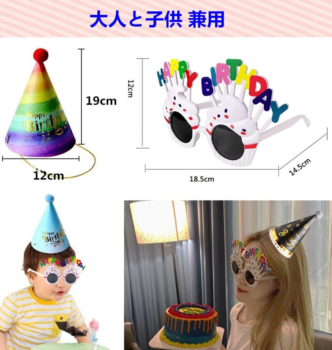 【パッケージ内容】--3組 誕生日メガネ、3個パーティーハット。色が鮮やかで綺麗で、とってもかわいいです。Happy Birthday の文字が可愛い ケーキ型 サングラス 2色(ピンク 、白い) , 黄色の風船をモチーフにしたサングラスの3種類セットです。3個バースデー帽子はマルチカラー、黒と青。