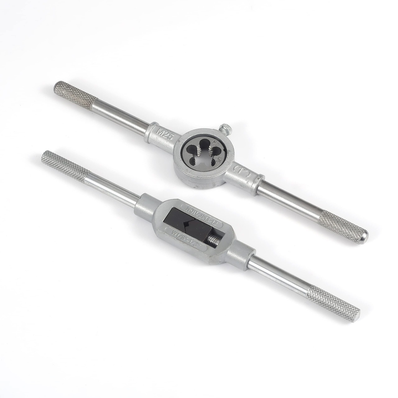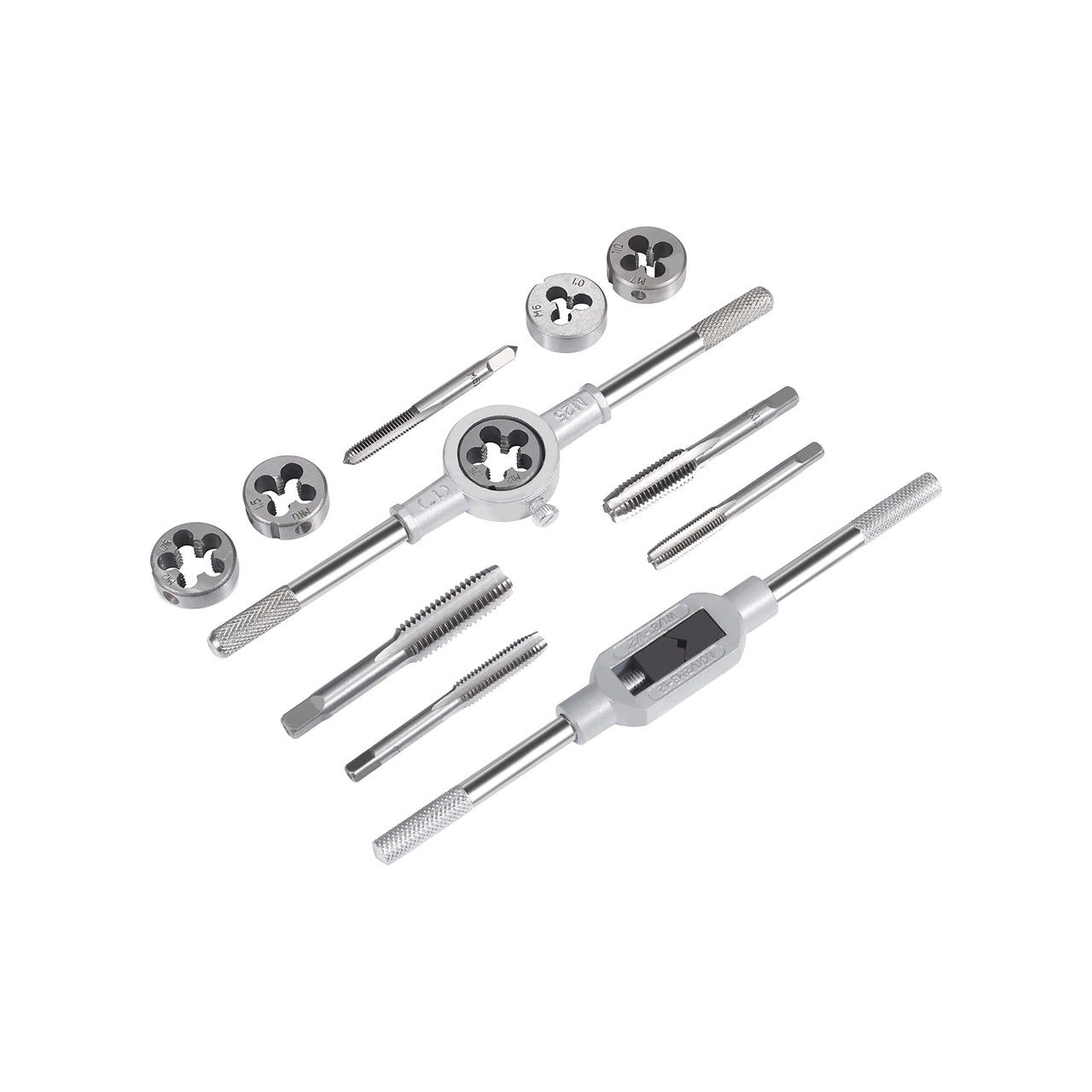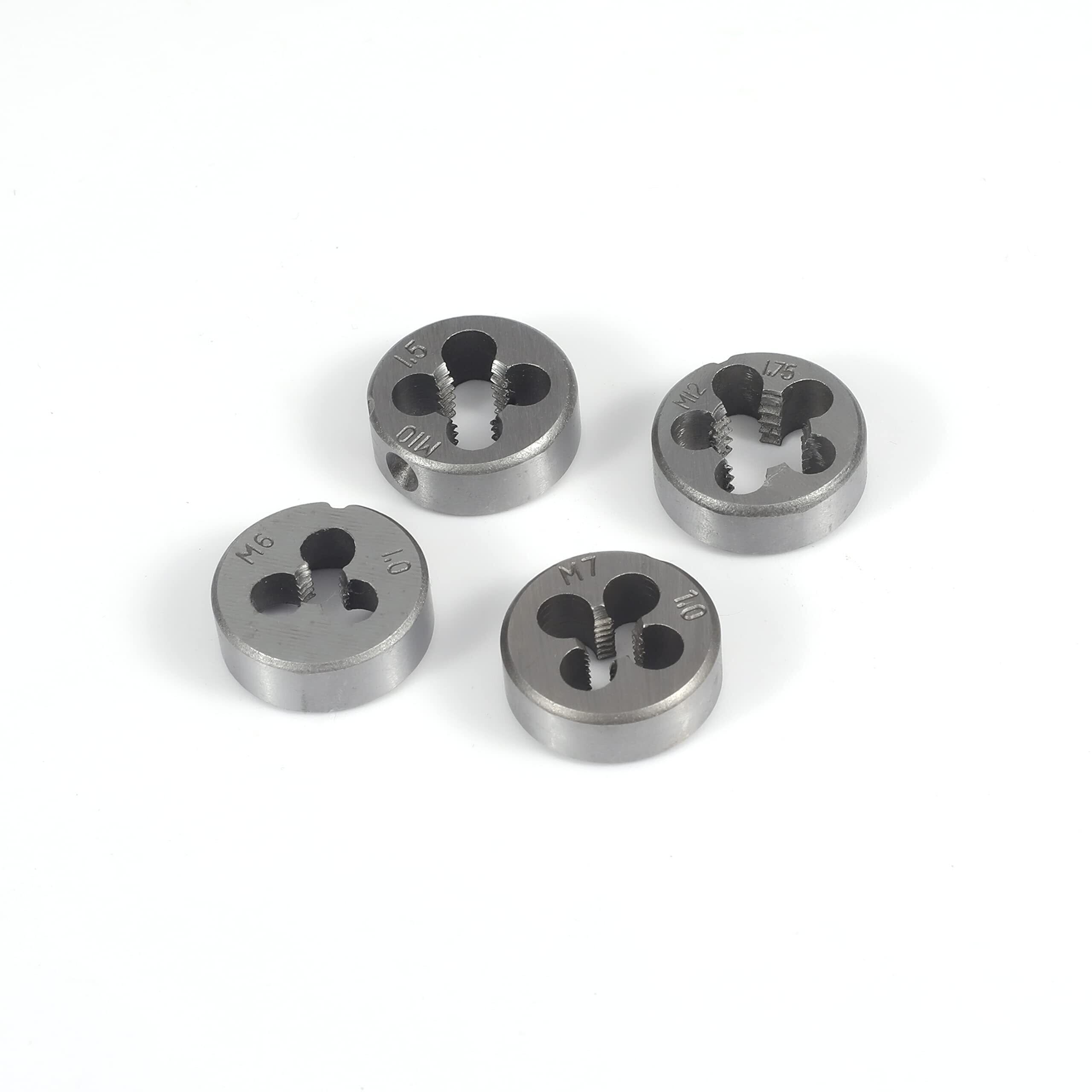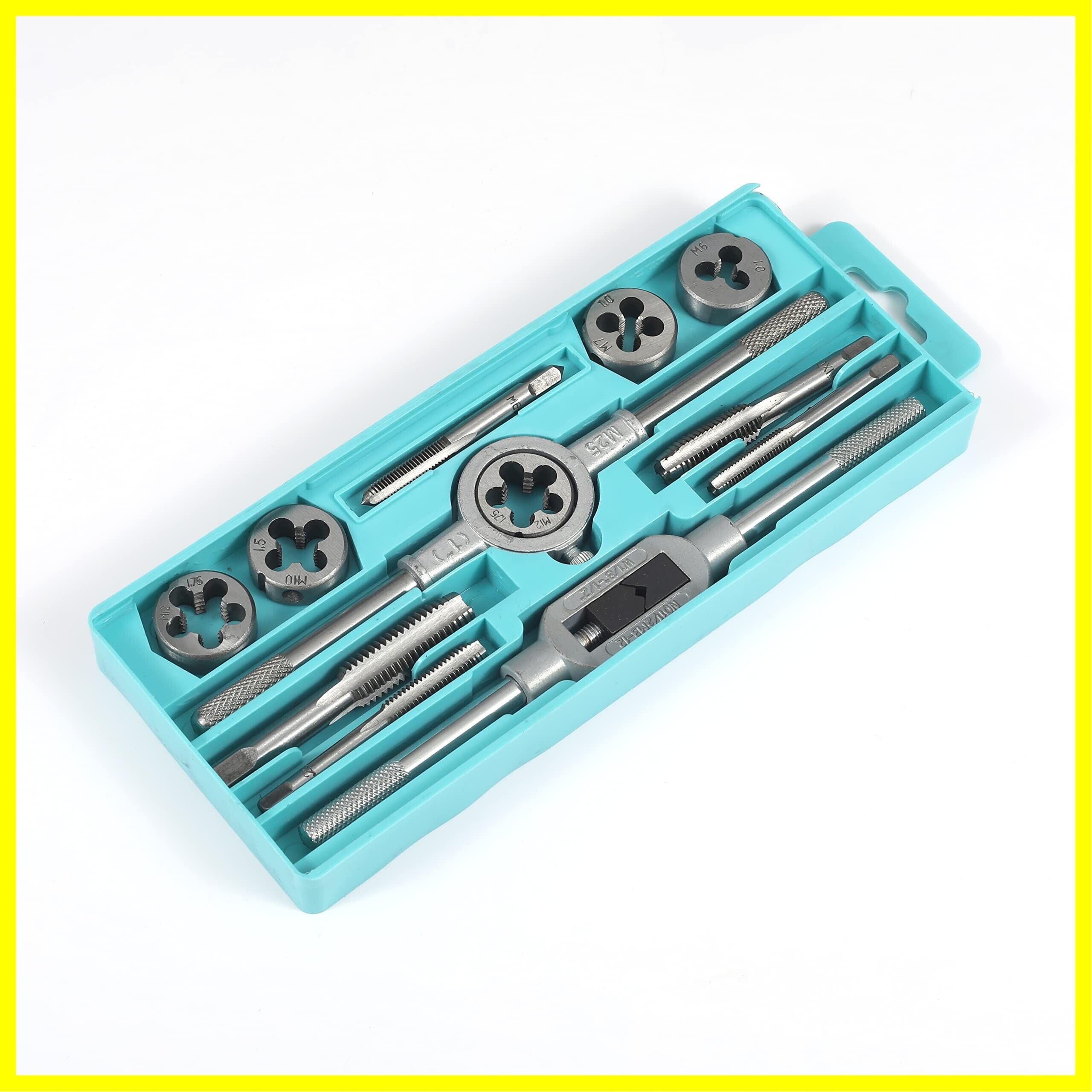 【12個セット】:ダイサイズ:M6×1、M7×1.0、M8×1.25、M10×1.5、M12×1.75mm。タップサイズ:M6×1、M7×1.0、M8×1.25、M10×1.5、M12×1.75mm。ダイホルダ1点 、M3-M12タップレンチ1点。