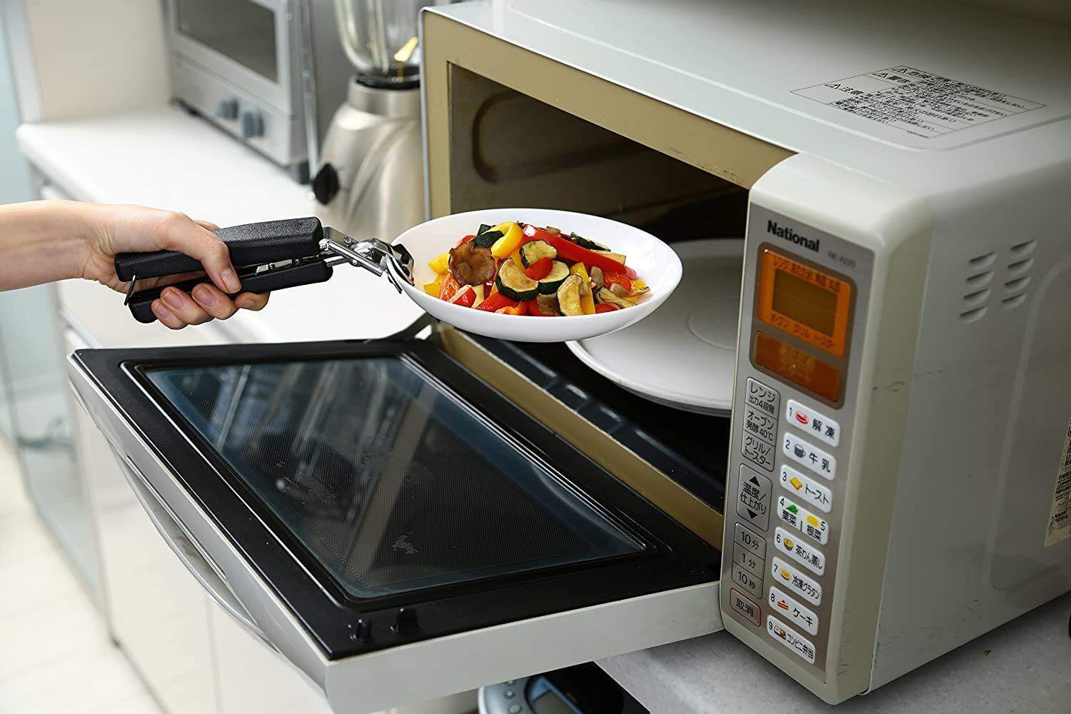 お皿・鉄板・網などいろいろつかめる鍋つかみ上向き下向きどちらでも挟んで持ち上げられる。