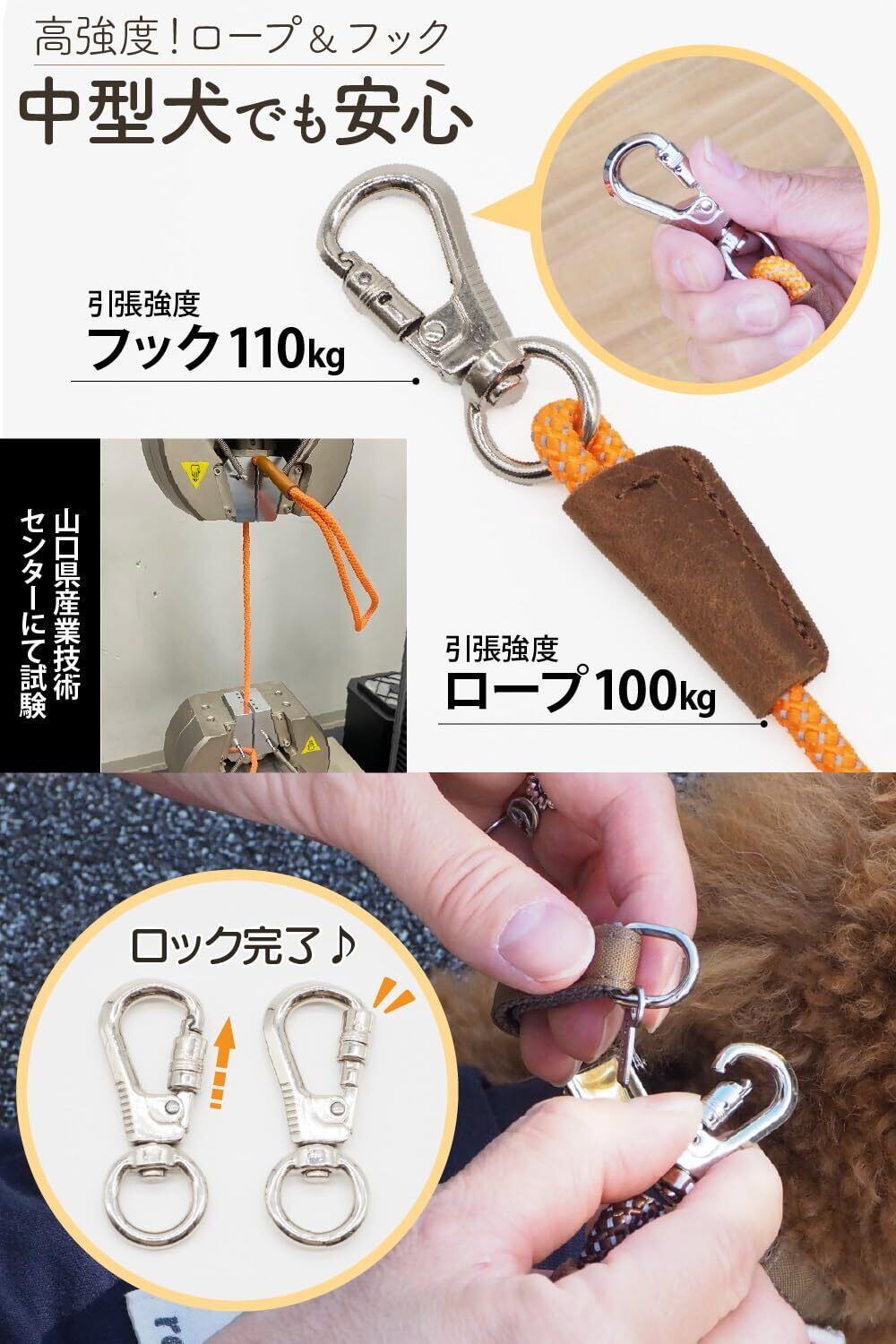 ③ 安心のロック付きフックで外れにくい 長さのあるロングリードは、犬との距離が遠くなるため、ナスカンが外れてしまうと非常に危険です。 そこで、フックにはロック機能付きのナスカンを採用。 愛犬がどれだけ走り回っても、安心して見守ることができます。 中型犬のパワーにも対応するしっかりした作りで、トレーニングや見守りに最適なロングリードです。