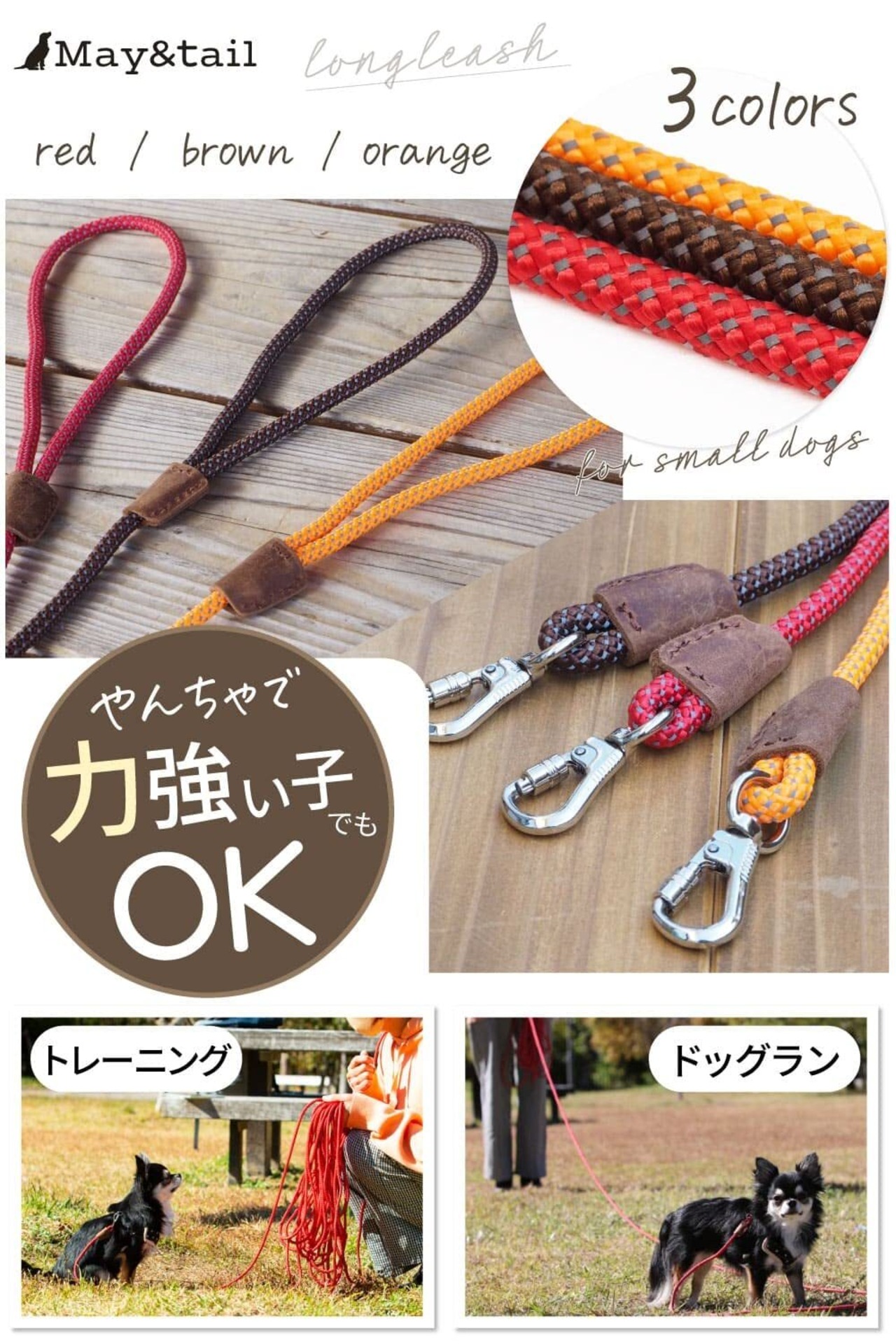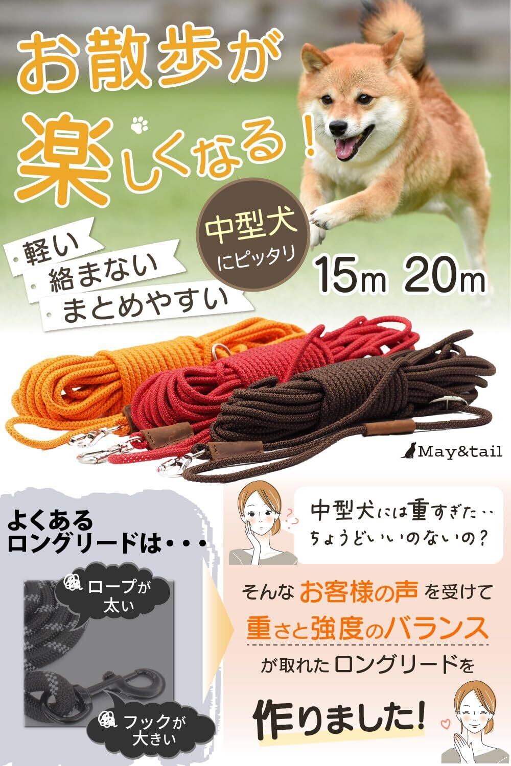 ① 中型犬にちょうどいいロングリードがほしい方へ 「小型犬用では強度が心配…」「大型犬用は重すぎて不安…」 そんなお声から生まれた、中型犬専用のロングリードです。 軽量かつシンプルな作りで、扱いやすさと安心感を両立。 無理なく使える長さと丈夫な素材で、柴犬やコーギー、ビーグルなどの中型犬にぴったりです。 重さや取り回しに悩むことなく、ワンちゃんを自由に遊ばせることができます。